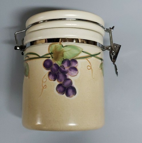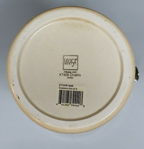 This sale is for a Set of Three (3) Mikasa Brand Canisters Ceramic Canisters KT 408 Chablis ~ Grape pattern Largest canister measures approximately 5.25" diameter x 9.25" tall Medium canister measures approximately 5.25" diameter x 8" tall Smallest canister measures approximately 5.25" diameter x 7" tall Canisters are in good ~ pre-owned condition Locking lid mechanisms are all in working conditions Design around outside is fired into the material (not a decal) Please view photos for a good description of this item Thank you!