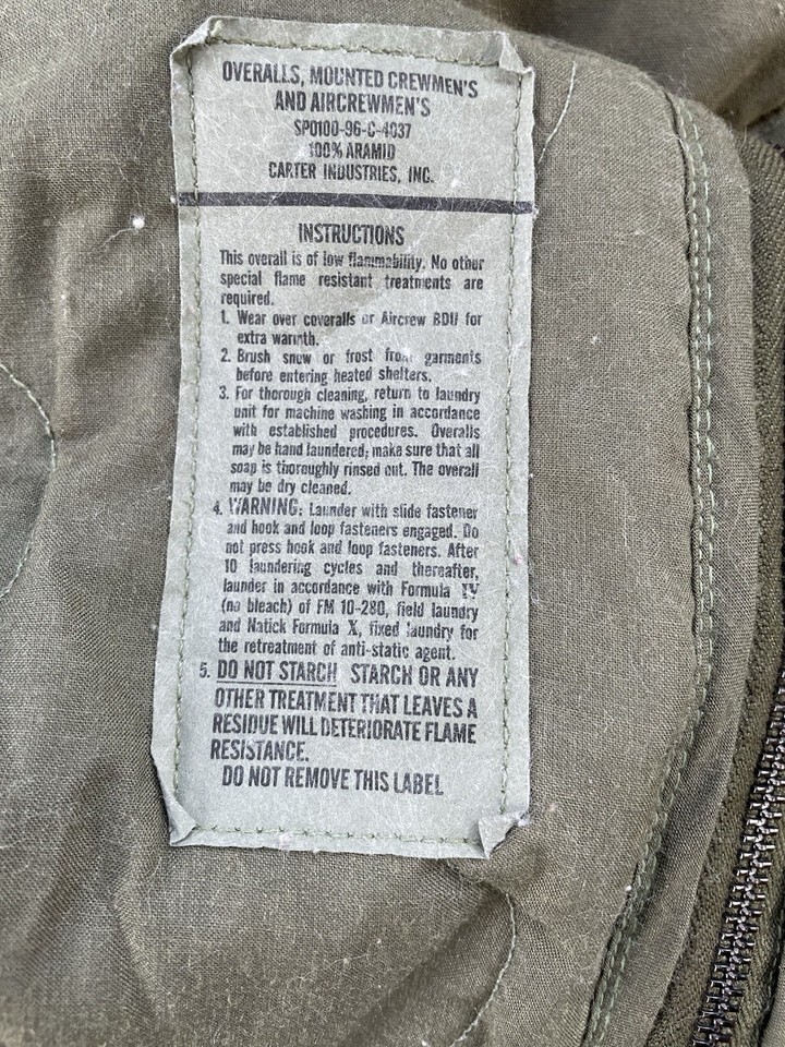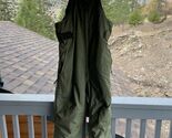This product is a pair of military winter overalls in size small. Made by the U.S. Military, they are designed with aramid material in a green color. These coveralls are suitable for specialized work clothing, providing durability and protection in cold weather conditions. Perfect for those in need of a reliable and tough piece of clothing for various tasks or job requirements.