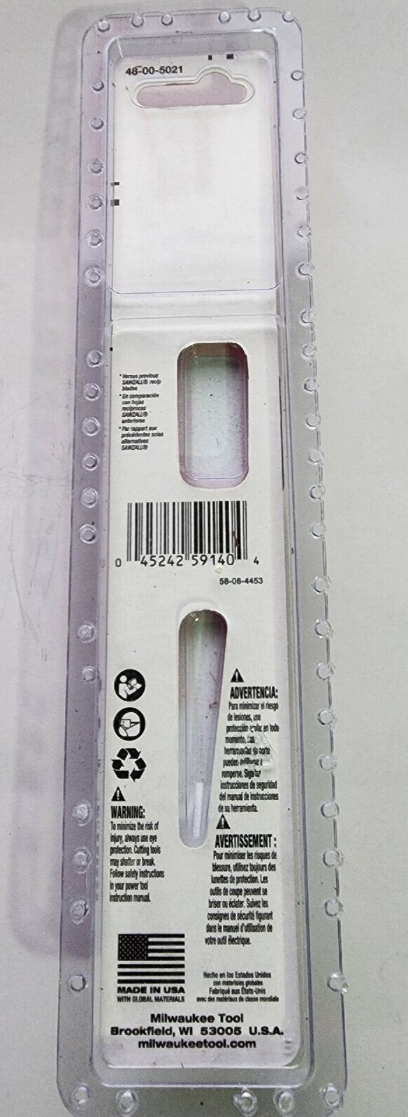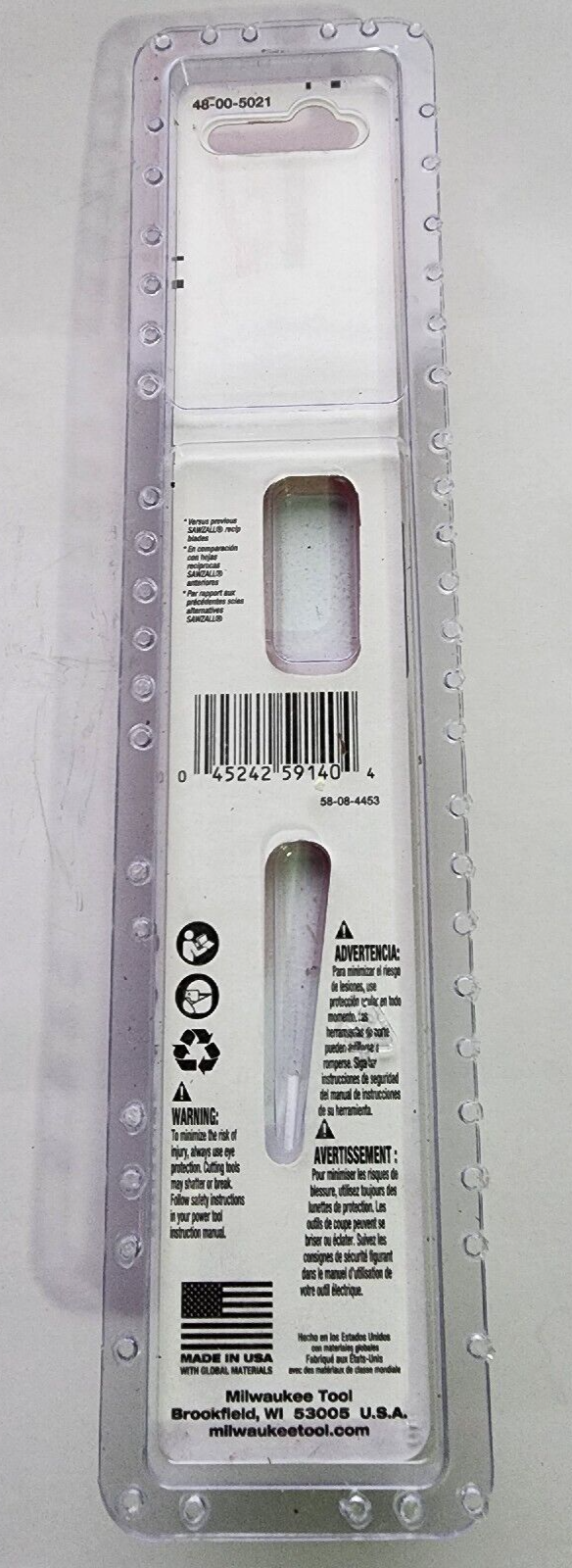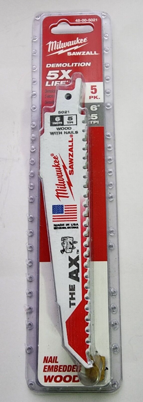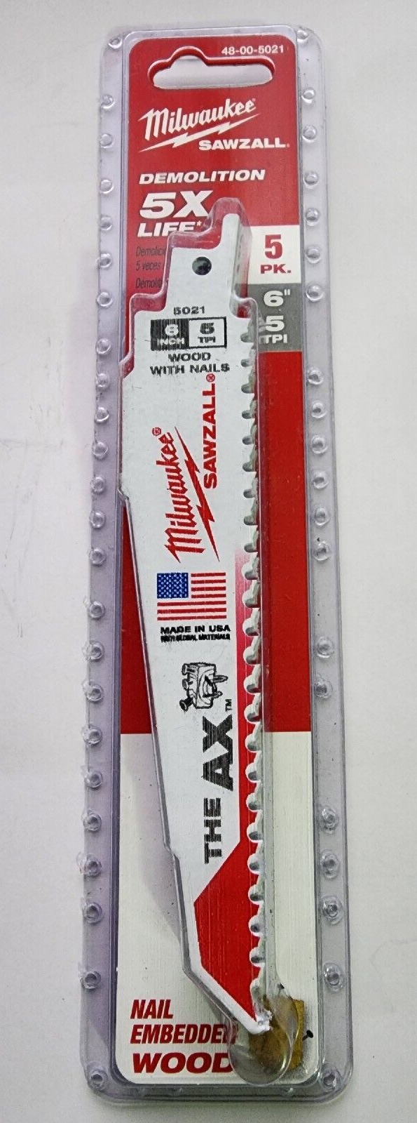 You are Buying a brand New And Factory Sealed Milwaukee 6 in. 5 TPI AX Nail-Embedded Wood Cutting SAWZALL Reciprocating Saw Blades (5-Pack) Model # 48-00-5021S..... Ideal for making tough, straight cuts. Up to 5X life over competitive reciprocating saw blades. Nail Guard tooth protection increases blade durability.