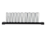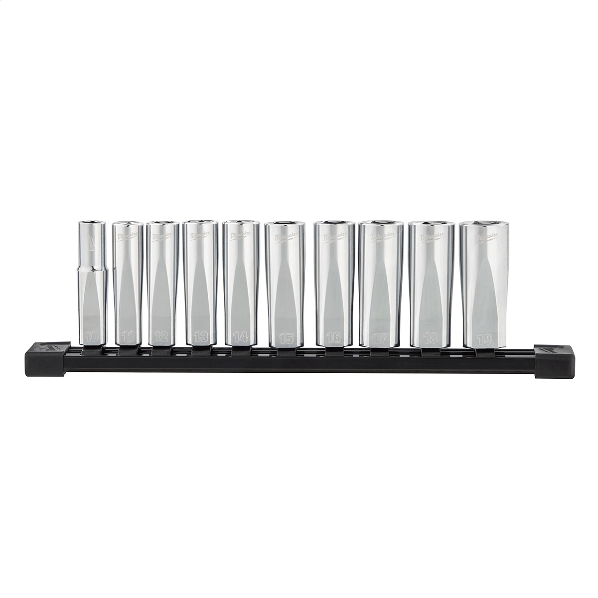 Milwaukee Tool 10pc 3/8" Metric Deep Well Sockets with FOUR FLAT SidesFeatures and Benefits:?FOUR FLAT? Sides deter rolling?Wrench-ready FOUR FLAT? Sides?Stamped sizes for better visibility?Optimized geometry to reduce rounding?6 Point Socket?Chrome Finish?Lifetime GuaranteeThe MILWAUKEE Metric 3/8" Drive 10-Piece Deep Well Socket Set feature 6-point sockets with FOUR FLAT? sides. This innovative design has four parallel flat sides, which deter rolling and are wrench-compatible. The socket sizes are stamped into the flats providing improved visibility. These deep well sockets have optimized geometry to reduce bolt rounding and stripping. This 10 piece socket set is stored on a socket rail for tool organization and is backed with a lifetime guarantee.