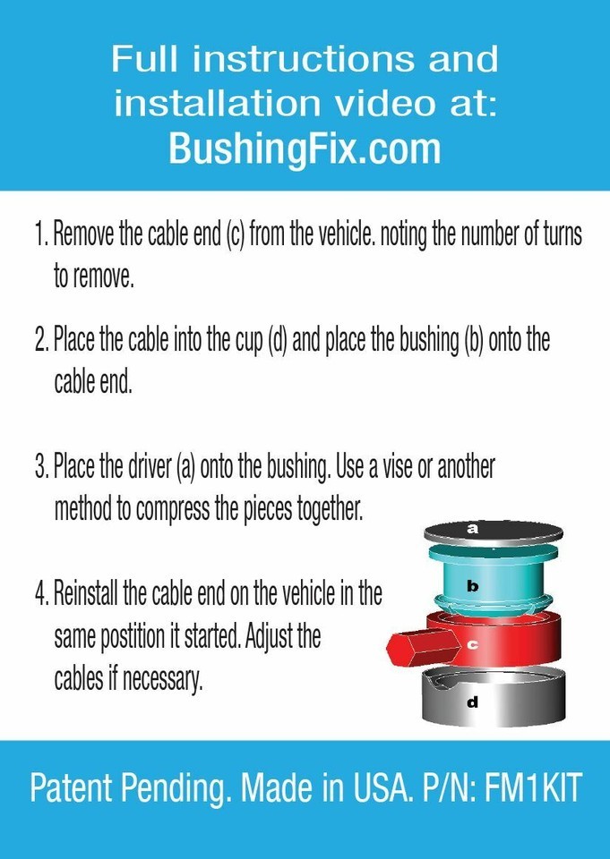 Our Mini Cooper (Manual Transmission) kit allows you to quickly and easily repair your shift cables by replacing the bushings. The patented (US patent #10,619,723 and #10,215,273) installation tools and custom molded replacement bushings ensure a quality repair with ease. A professional can perform this repair in under 15 minutes, average time for a non-professional is less than 30 minutes. These bushings are made from a material that will outlast the factory bushings and the kit includes everything needed to install. Bushing Fix FM1KIT?- Transmission Shift Cable Bushing Repair Kit ?; (US Patent # 10,215,273 and US Patent # 10,619,723).
