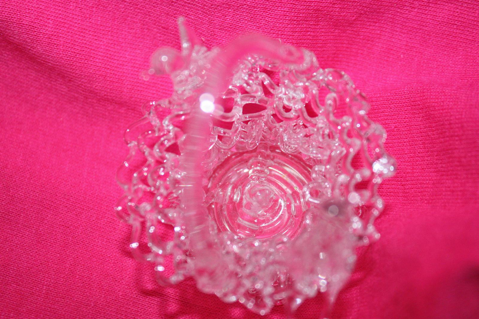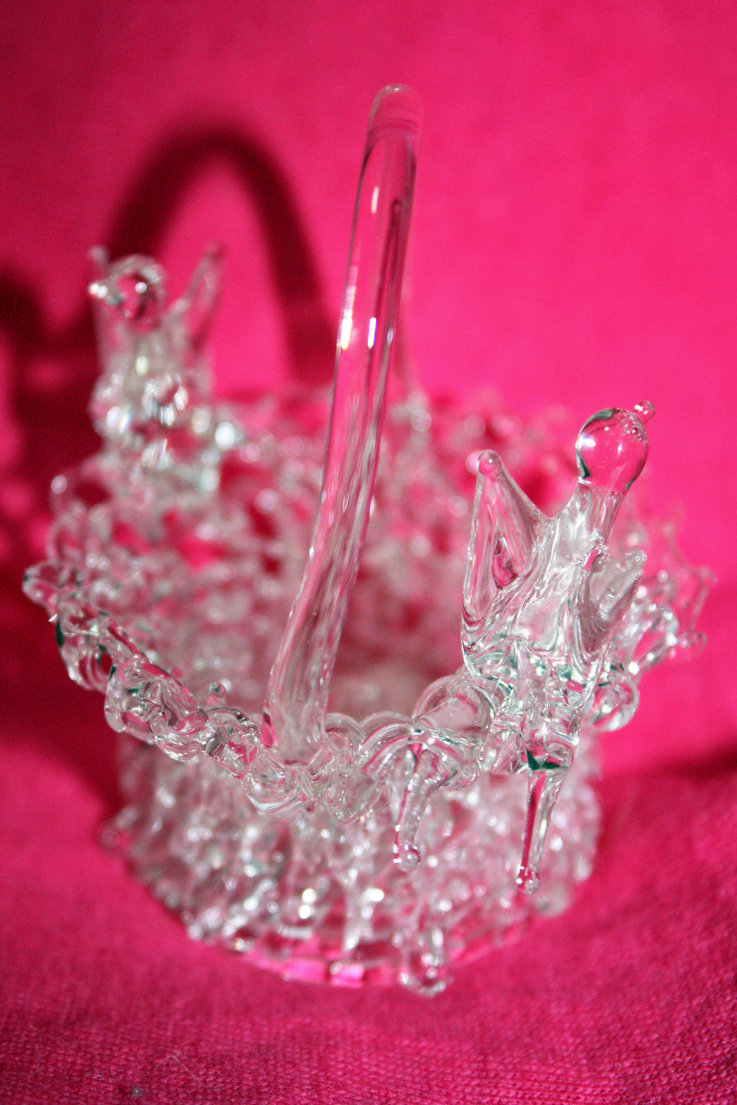 This is a cute miniature clear glass basket that is in excellent condition. It is made to look like a woven basket and has 2 small glass birds sitting on the lip of the basket. The basket weave is open. The birds are attached to the basket as one piece, not glued on afterward. There are no chips, cracks, or breaks on the piece. The basket is 2 7/8" tall, 1.5" wide base, 2" wide across the top, and the basket base height is 1.25". Sold as is as it's an estate piece. Smoke Free Environment. Buyer is responsible for all shipping charges. Combined shipping is available. Message me with any questions.
