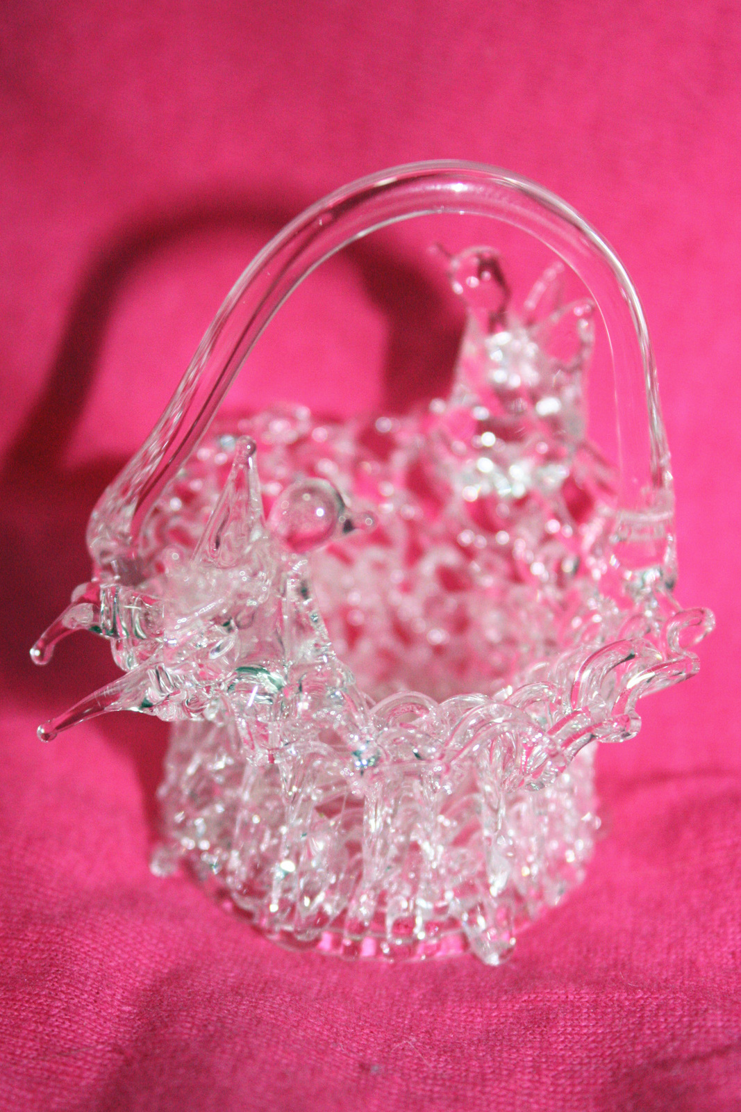 Miniature Clear Glass Woven Basket w/ Birds - Shelf Sitter - Home Decor