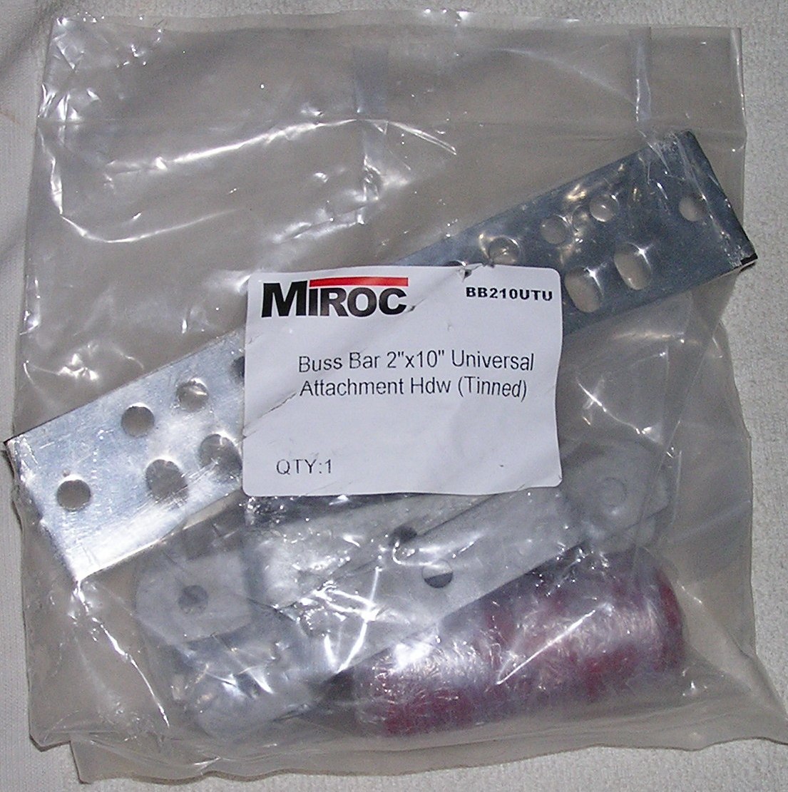 This listing is for a Miroc part number BB210UTU Buss Bar 2" X 10" Universal Attachment Hardware (Tinned). New in original packaging. Your satisfaction is guaranteed. All items are shipped via the US Post Office (USPS). I make every effort to ship your item within 24 hours following receipt of payment, except for Sundays or Holidays when the post office is closed.