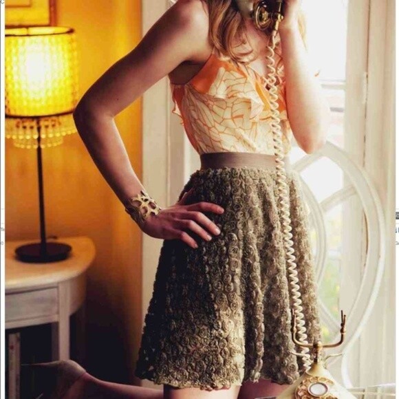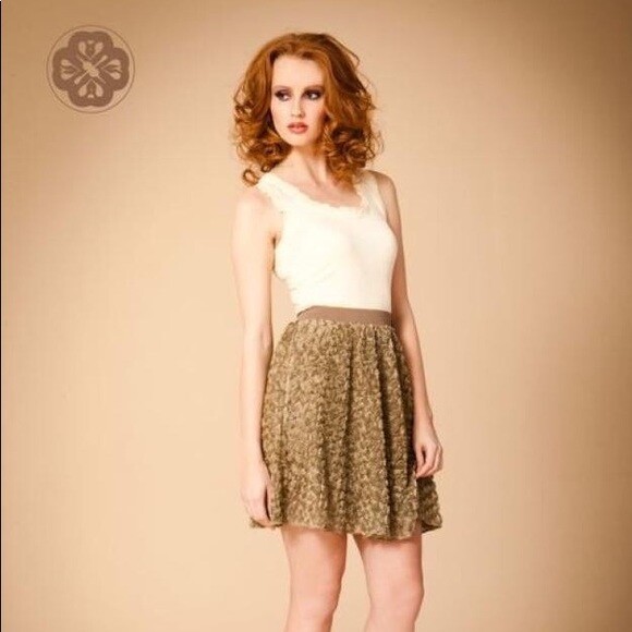 This sale is for one (1) Mischa Barton brand skirt The Rose Skirt Women's Size Large Caramel in color The Rose Skirt features a raised rose motif detail ~ which is vintage inspired Rose design on a net background Skirt has a large elastic waistband to keep you tucked in Fully lined skirt 100% Polyester ~ buttery soft fabric Skirt measures approximately 19.5" from top of waistband to hem Skirt measures approximately 13" across waistband when flat ~ unstretched Skirt is brand new in original packaging Please view photos for a good description of this skirt Thank you!