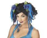 BLUE THEME: Hair color is a mix with a darker blue, lighter blue, and black. Curly dreads with a longer braid and flower accent near the comb