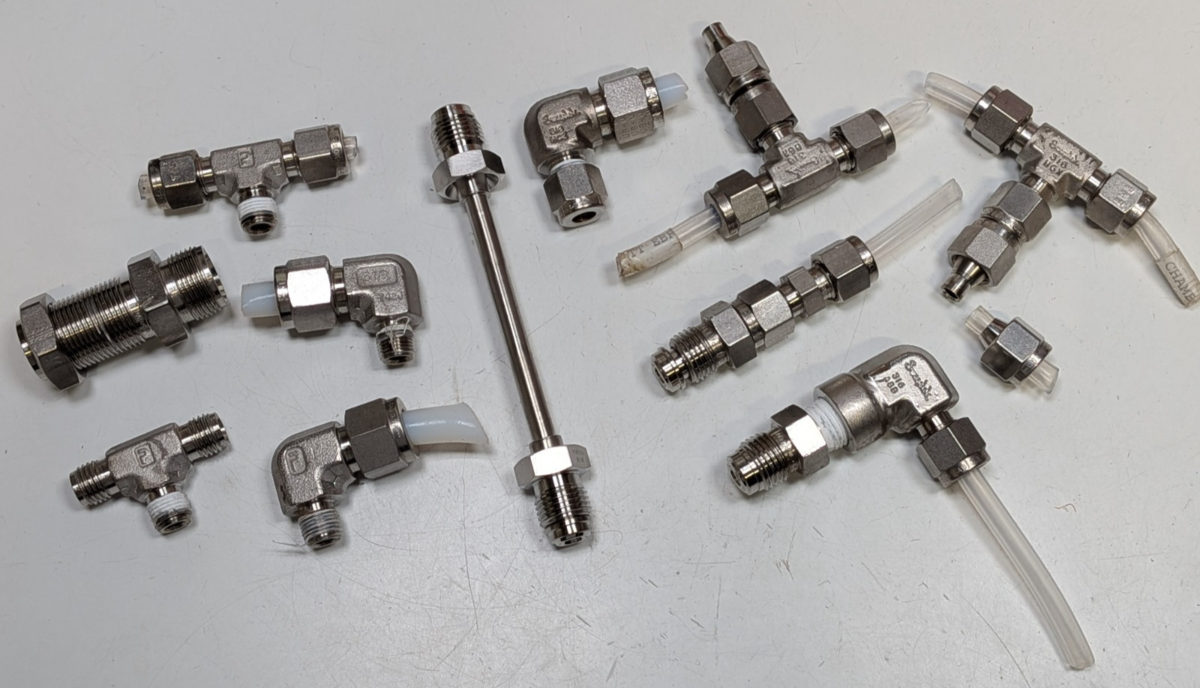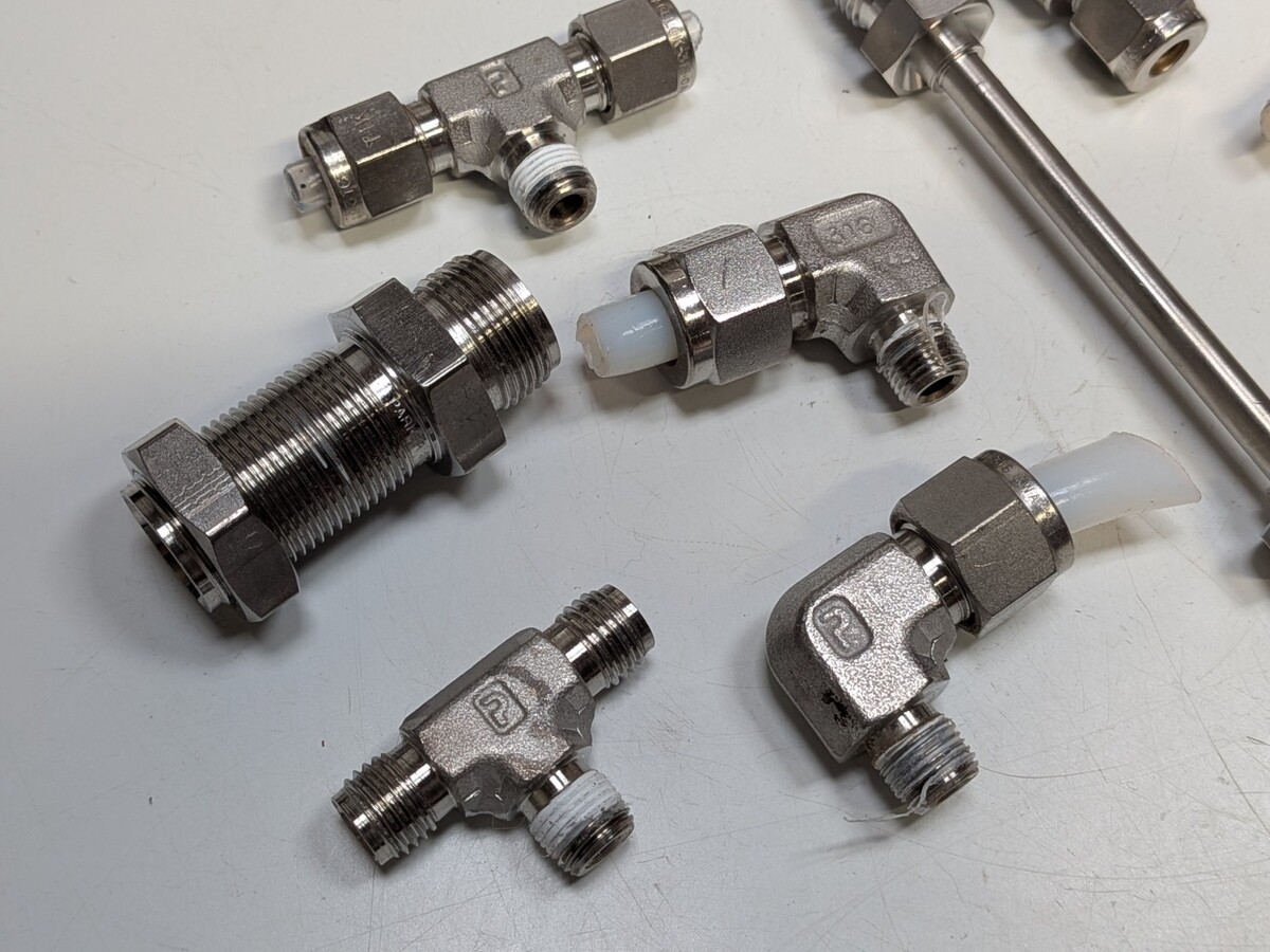 Nice mixed lot of various fittings in various sizes. The 5 to the left of the Fujikin tube are Parker and the fittings to the right are Swagelok