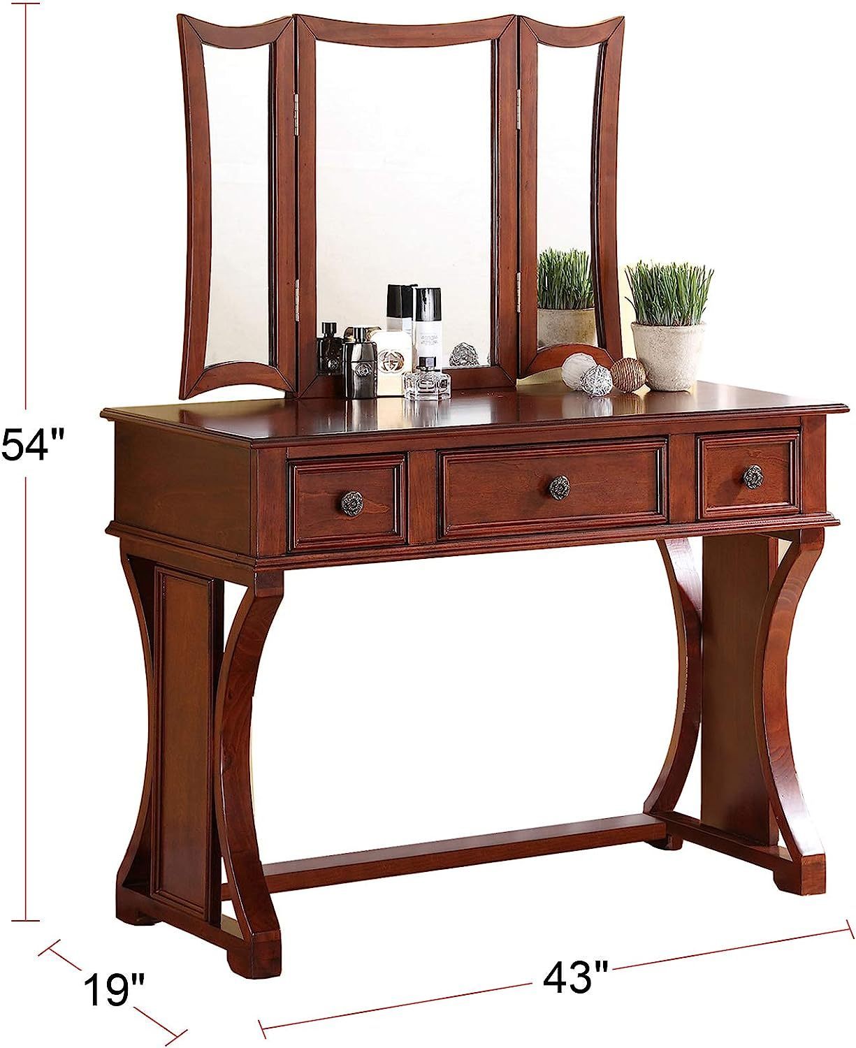 This beautifully designed vanity set features pine wood frame of rustic style. It includes a 3-panel mirror, table with functional drawers, and a cushioned stool. Each pieces is framed in feminine curves and lines making it the perfect addition to your bedroom. Available in black, apple green, cherry, and white.
