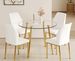 - Modern Luxury Glass Dining Table & 4 White PU Chairs Set - Gold Legs