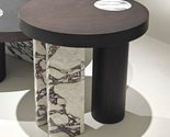 Product description: Transform your living space with this modern minimalist marble inlay side table. Measuring 15.7 by 15.7 by 23.6 inches, this luxurious end table features a stunning dark wood round top with genuine marble accents, supported by an artistic tri-leg pedestal that combines a glossy black cylinder with twin geometric marble columns. The sophisticated design creates a perfect balance of form and function, ideal for compact living areas as a sofa end table, nightstand, or decorative accent piece. Crafted from high-density board, premium wood veneer, and genuine sintered stone, this Interoknack table offers exceptional durability with a smooth, scratch-resistant surface that maintains its elegant appearance with minimal maintenance. The table arrives fully assembled, ready to instantly elevate any room with its timeless refinement and contemporary aesthetic. Whether placed in a living room, bedroom, or apartment, this versatile piece serves as both a practical surface for essentials and a striking design element.