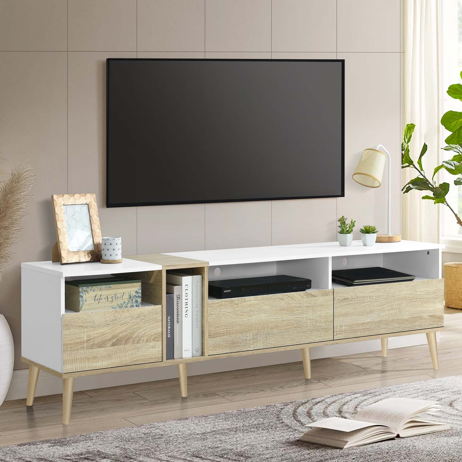 [Ample Storage] With 3 spacious drawers and 4 open storage compartments, this TV stand offers ample storage space for all your media essentials, gaming consoles, DVDs, and more.