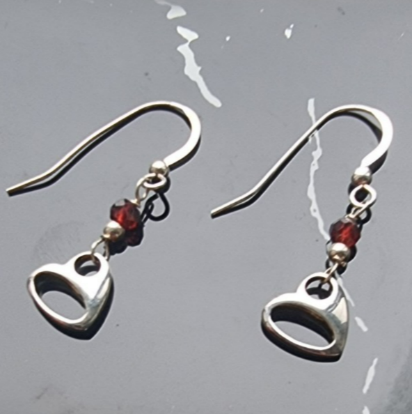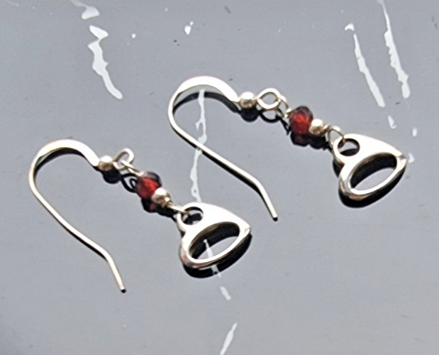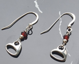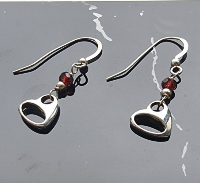 This product is a pair of vintage MODERNIST 925 sterling silver dangle earrings featuring a red garnet stone and heart accents. The earrings are signed, have a hook closure, and are crafted with sterling silver. The design showcases a modernist style with a focus on beauty, making it a unique and elegant accessory for any jewelry collection. The use of a red garnet stone adds a pop of color to the silver setting, creating a striking contrast that is sure to make a statement.