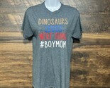 This is a gray cotton T-shirt with a round neck and short sleeves. It features a funny "Mommy Dinosaur" design, perfect for mothers who love dinosaurs. The shirt is designed for unisex adults in size small petite and is machine washable. The brand is Gildan and it is suitable for summer, fall, and spring seasons. Perfect for a casual and fun look!