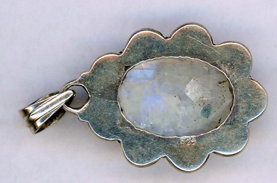 Dieser Anhanger ist in einen silbernen Rahmen montiert. Der Anhanger ist Mondstein, der variiert