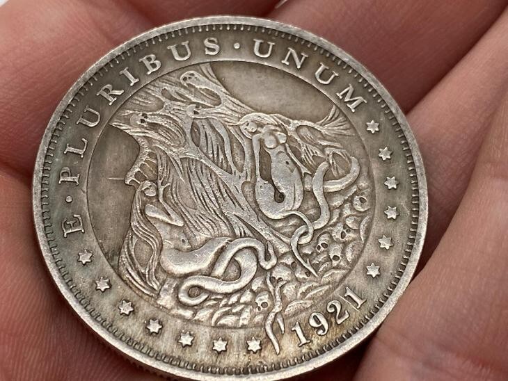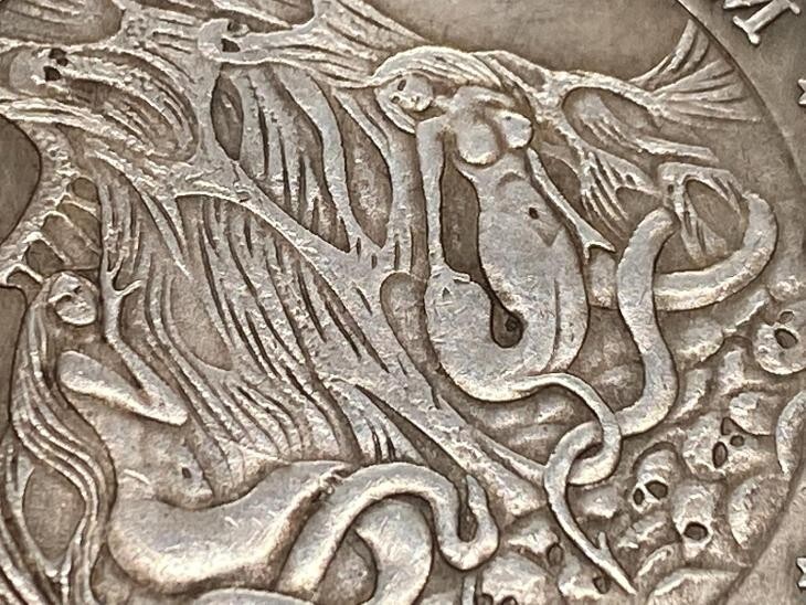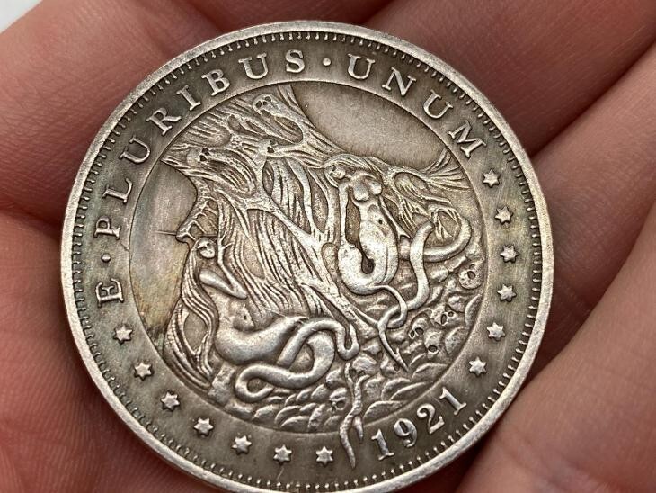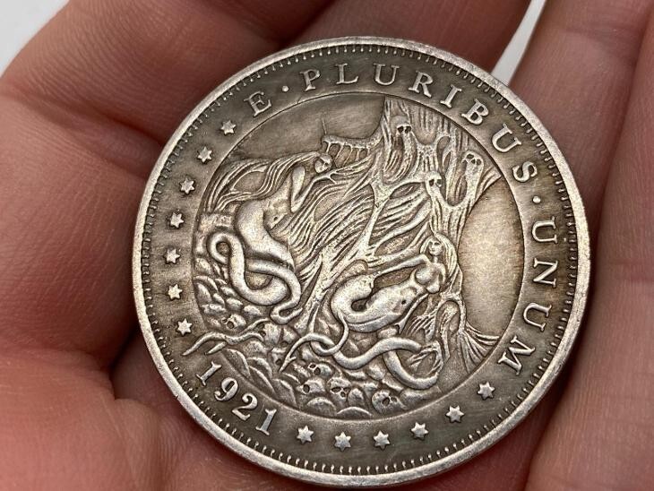 Descubre una pieza única de la historia estadounidense con nuestra moneda de fantasía de dolar Morgan de 1921 con sirenas intrincadamente grabadas. Esta moneda distintiva se ha transformado artísticamente en el celebre estilo de "níquel hobo", donde el dolar original ha sido adornado con grabados detallados que retratan encantadoras sirenas y serpientes serpenteando alrededor de un arbol. Originado durante los tiempos tumultuosos de la Gran Depresion, este estilo de moneda modifica las monedas tradicionales en obras de arte notables, a menudo creadas por aquellos al margen de la sociedad. El anverso de la moneda conserva el motivo clasico del dolar americano, que muestra la inscripcion "E PLURIBUS UNUM" junto con los grabados personalizados. En el reverso, el diseño original del famoso dolar Morgan permanece intacto, encarnando su significado historico. El dolar Morgan ha sido un símbolo de la moneda estadounidense desde su introduccion en 1878, capturando los corazones de los coleccionistas de todo el mundo. Diseñado por el experto grabador George T. Morgan, cuenta con un aguila majestuosa con alas extendidas encaramadas en una corona de laurel, emblematica de la paz y la preparacion para la defensa. Esta moneda no solo sirve como un artículo de coleccionista, sino tambien como un iniciador de conversacion, lo que refleja el arte y la resistencia de su epoca. Añade esta extraordinaria pieza a tu coleccion hoy y posee una porcion de historia que continúa cautivando a los entusiastas de todo el mundo.