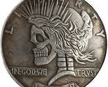 Esta cautivadora reinvencion del iconico dolar estadounidense de la paz de 1923 cuenta con un llamativo diseño de "horror" que transforma la imagen clasica de la libertad. En el anverso, una calavera reemplaza la representacion tradicional de la diosa, introduciendo un simbolismo oscuro de muerte y transicion. Esta modificacion es un testimonio del arte del grabado moderno y rinde homenaje al estilo único "Hobo" de alteracion de monedas que gano popularidad en los siglos XIX y XX. El reverso conserva la imagen original del aguila de la paz, pero ha sido rediseñada creativamente en una forma esqueletica, reforzando los temas de la mortalidad y el renacimiento. Tales piezas son muy buscadas por los coleccionistas de monedas inusuales y artísticas, cada una con un profundo mensaje filosofico. La moneda mide 38 mm de diametro y tiene un grosor de 2,5 mm, por lo que es una adicion impresionante a cualquier coleccion.