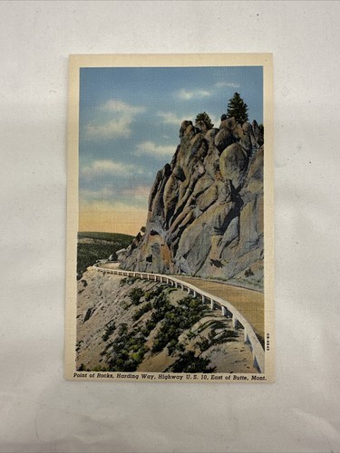 This is a linen postcard featuring a country road highway in Butte, Montana. The postcard depicts Point Rocks and Harding Way, and is part of the topographical postcards category. It is new and has not been used.
