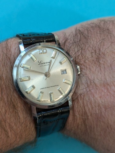 Cette montre-bracelet vintage Lucerne est une montre classique pour homme avec un boîtier argente de 34 mm et un bracelet noir. La montre comporte des index batons sur une lunette blanche et un affichage analogique. Il fonctionne et est pret a porter. La montre n'est pas personnalisee et appartient aux categories Montres-bracelets, Montres, Pieces et accessoires de montres et Bijoux et montres. La marque est Lucerne et les couleurs du boîtier et du bracelet sont respectivement argent et noir.