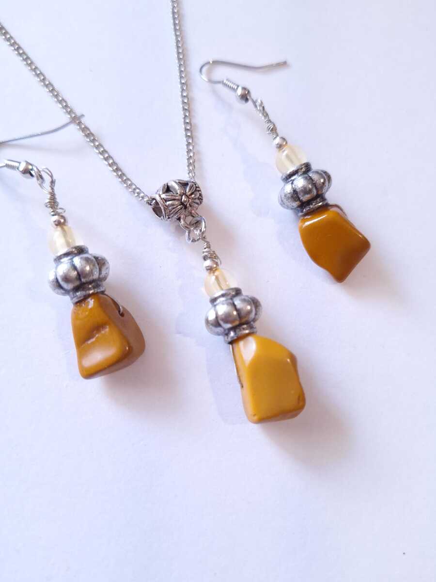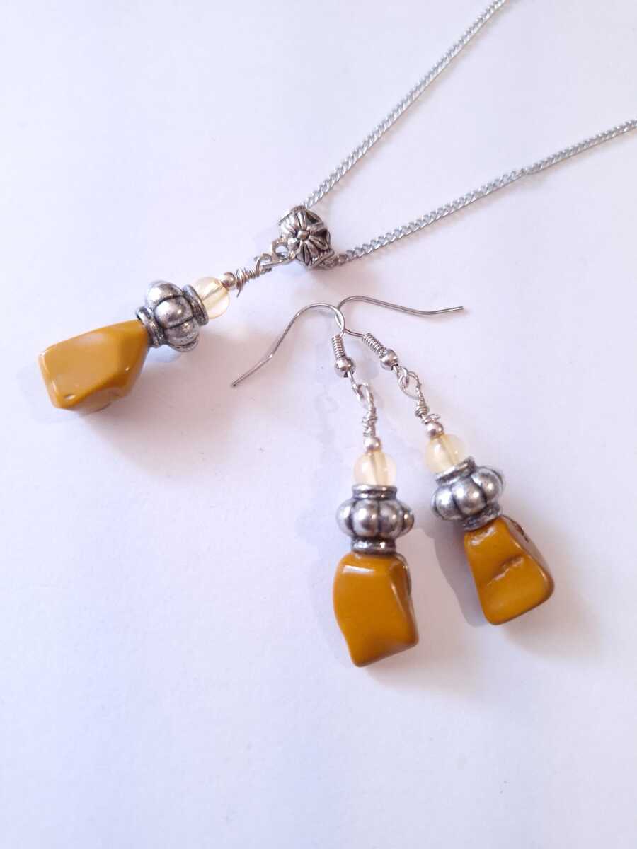 Victorian set silver-tone jewelry set and mustard yellow Mookaite Jasper and plastic beads earrings and necklace Bohemian set jewelry set boho jewelry set antique style jewelry set.