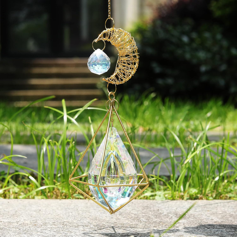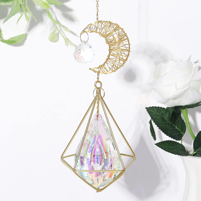 Moon Star Crystal Suncatcher Hanging Chandelier Crystals Ball Prisms Window Suncatchers Rainbow Maker Pendant for Home Garden Car Rear View Mirror Charms Hanging Decoration