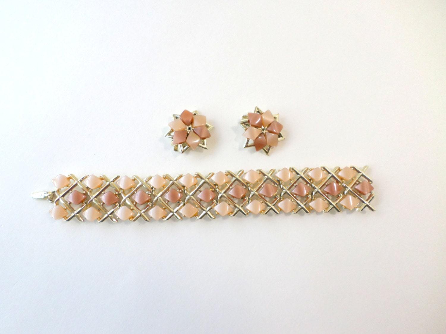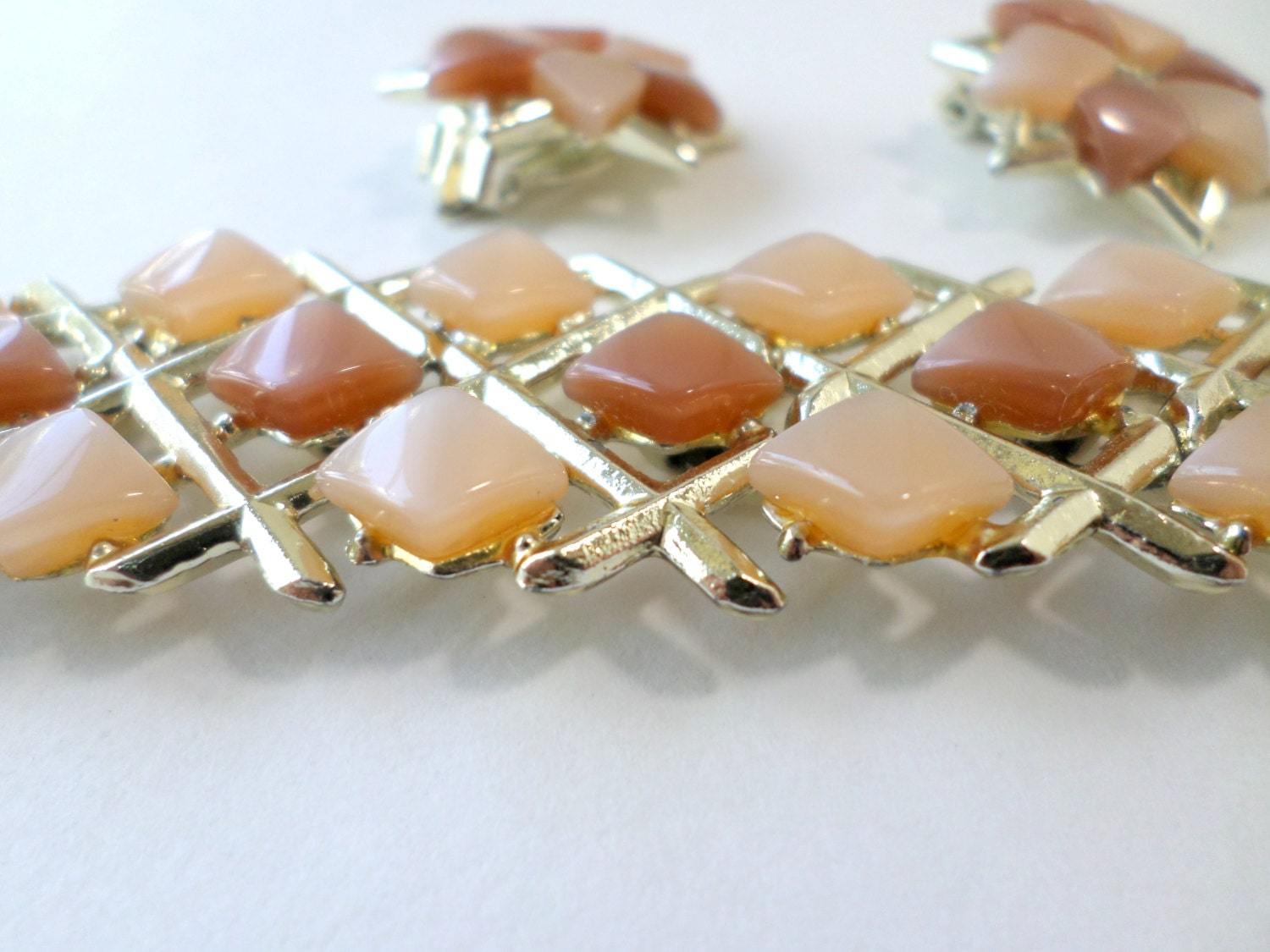 - Moonglow Lucite Neutral Color Wide Bracelet & Matching Clip Earrings