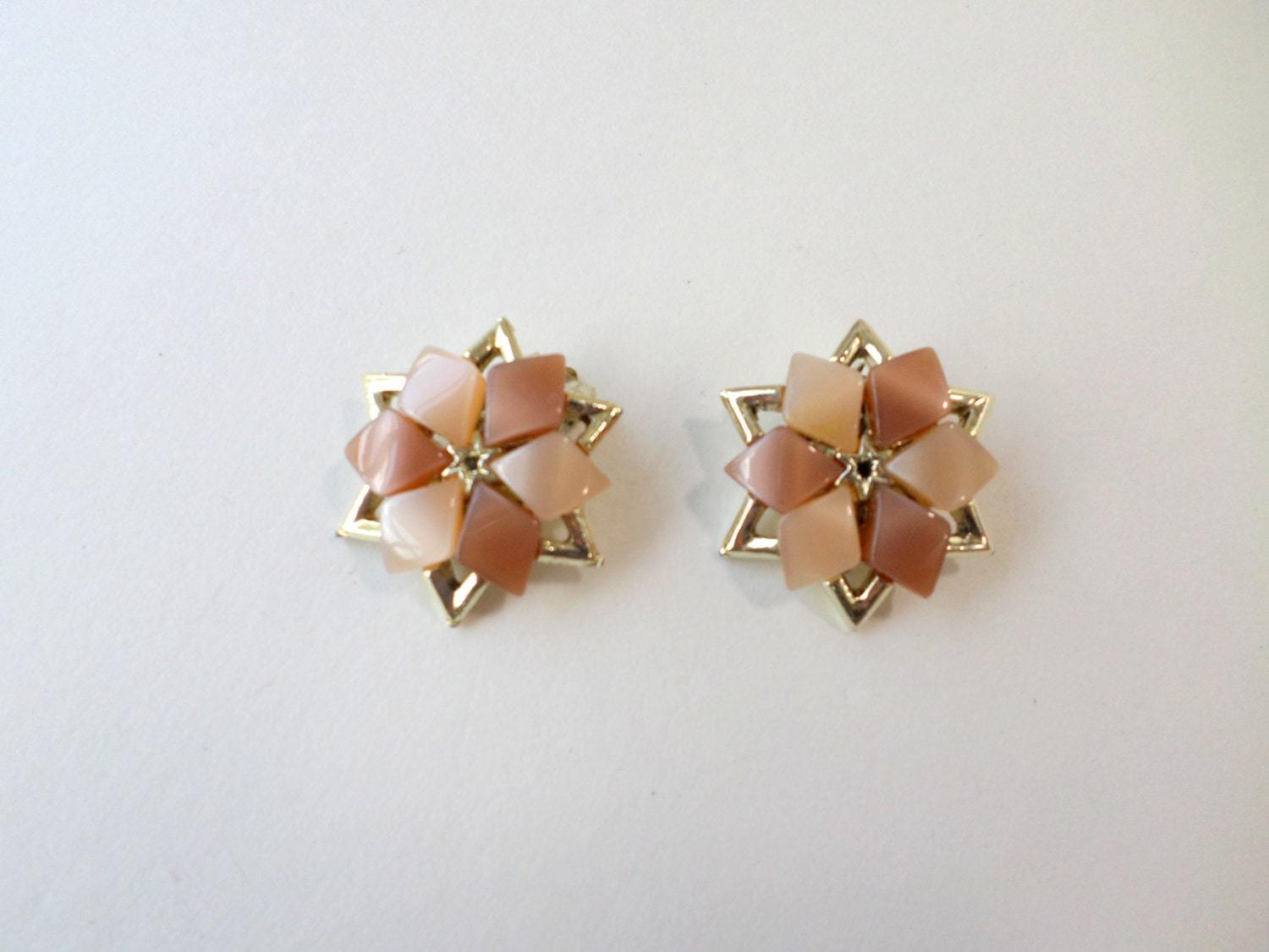 ?Style/Features: all original, geometric cut moonglow lucite in warm neutral colors, earring clips are strong, substantial pieces would look great stacked