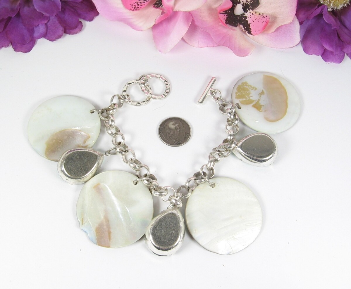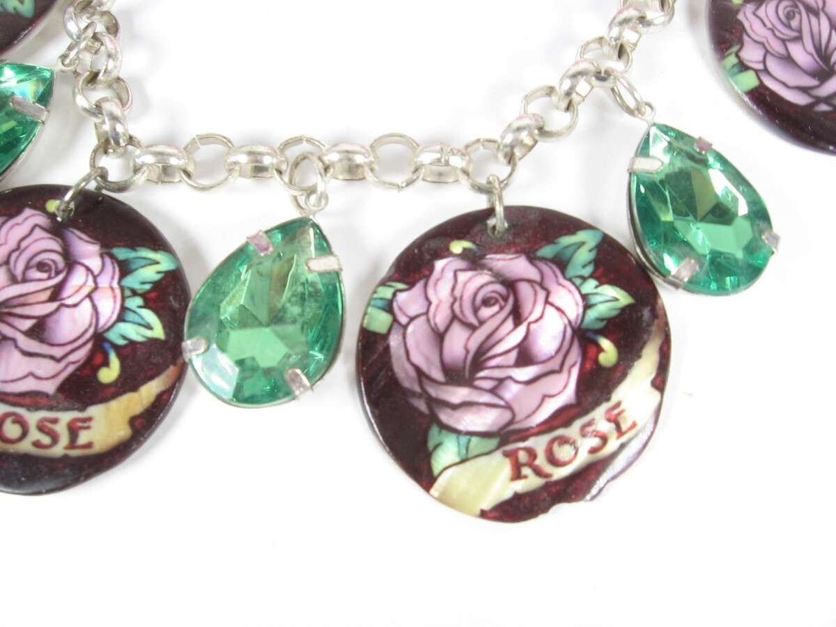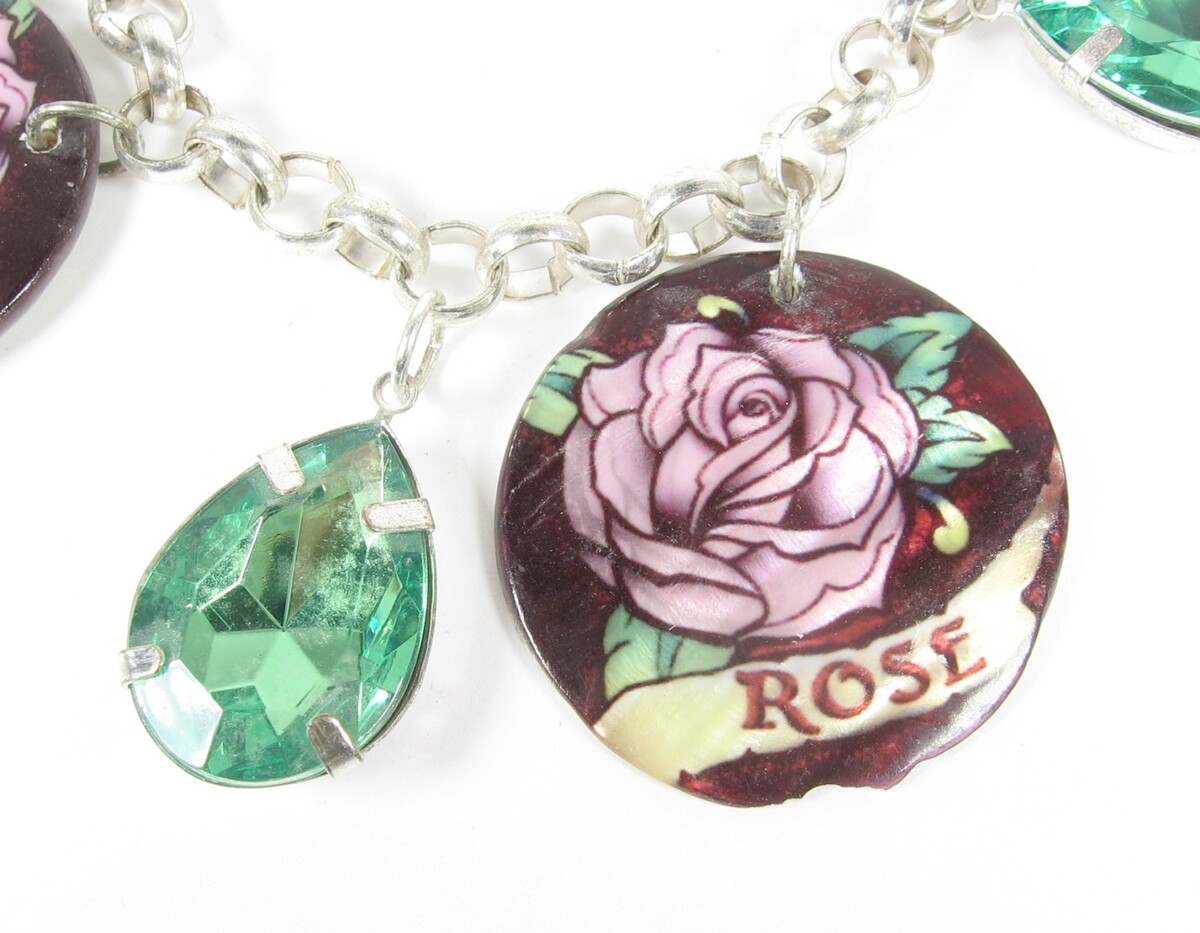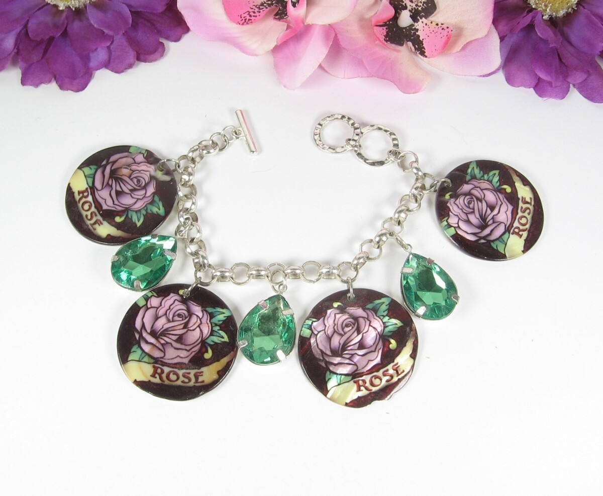 MOP Shell PINK ROSE Vintage CHARM BRACELET Green Pear Gems Silvertone 7-8" In a lightweight silvertone metal, this is an amazing vintage MOP ROSE CHARM BRACELET! The rolo style chain has 7 Charms. Four of the charms are round and made of Mother of Pearl shell. The design on the front shows a pink rose, green leaves and a yellow banner that reads "ROSE" giving a tattoo like vibe. These colors are either dyed, painted or transferred onto the seashell. There are three large pear shaped green plastic faceted "gems" prong set into a silvertone back. FOR THE LOVER OF ROSES! STONES/MATERIAL: MOP Shell with dyes, paints or transfer, green plastic pear gems METAL: Silvertone Metal CLASP: Toggle MEASUREMENTS: Two places Toggle clasp can have the bracelet measure 7" or 8", MOP charms measure 1" and green plastic gems measure 1/2" CONDITION: This piece of jewelry is in pre-owned and vintage used condition. Two of the MOP charms have chipping on the bottom and back, only one has chips that can be seen from the front, but both are rough. The toggle clasp is in full working order. There is scratching and finish wear present. Just Jewelry by mrzipmdo