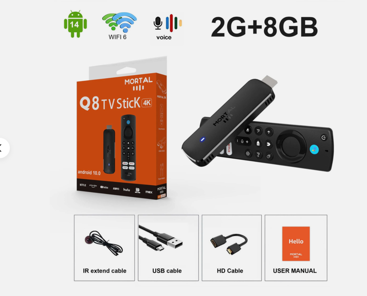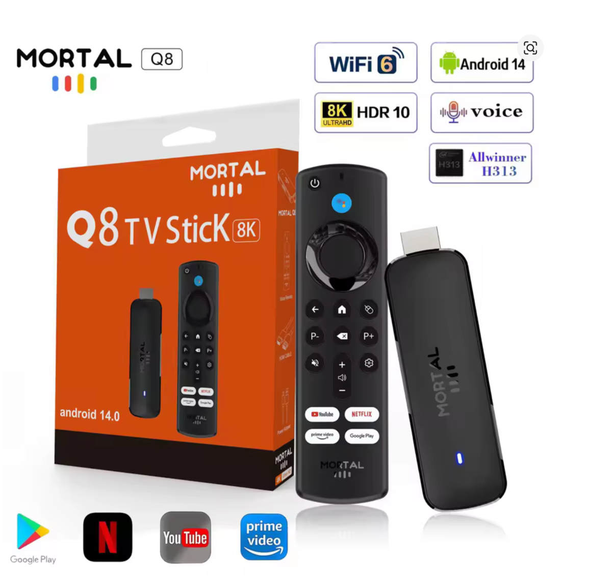 Mortal Q8 Android14 TV stick WIFI6 Voice Control TV stick 8K video Allwinner H313 Netflix YouTube Tv box Free Live TV Streaming Chromecast built-in Stream your favorite entertainment and apps from your phone, tablet or laptop right to the big screen. Brand : LVMAO/MORTAL connection technology:Wi-Fi, HDMI, Ethernet special features : Chromecast Supported Internet Netflix, Prime Video, Hulu, Google , YouTube,and more Product size: 10.6Length x 3.0 Width x 1.0Height cm Product weight: 0.195KG CPU: Allwinner H313 Quad Core ARM Cortex A35 GPU: Mail-G31 MP2 Memory: DDR3 2GB, eMMC 8GB/eMMC16GB USB host: 1*high-speed USB 2.0, Operating system: Android 14.0 Power supply: DC 5V/2A Supported language type: multilateral languages Package Include 1* Q8 TV stick 1*Voice Remote control 1* HD Cable 1* USB power cord 1*IR cable 1*User Manual