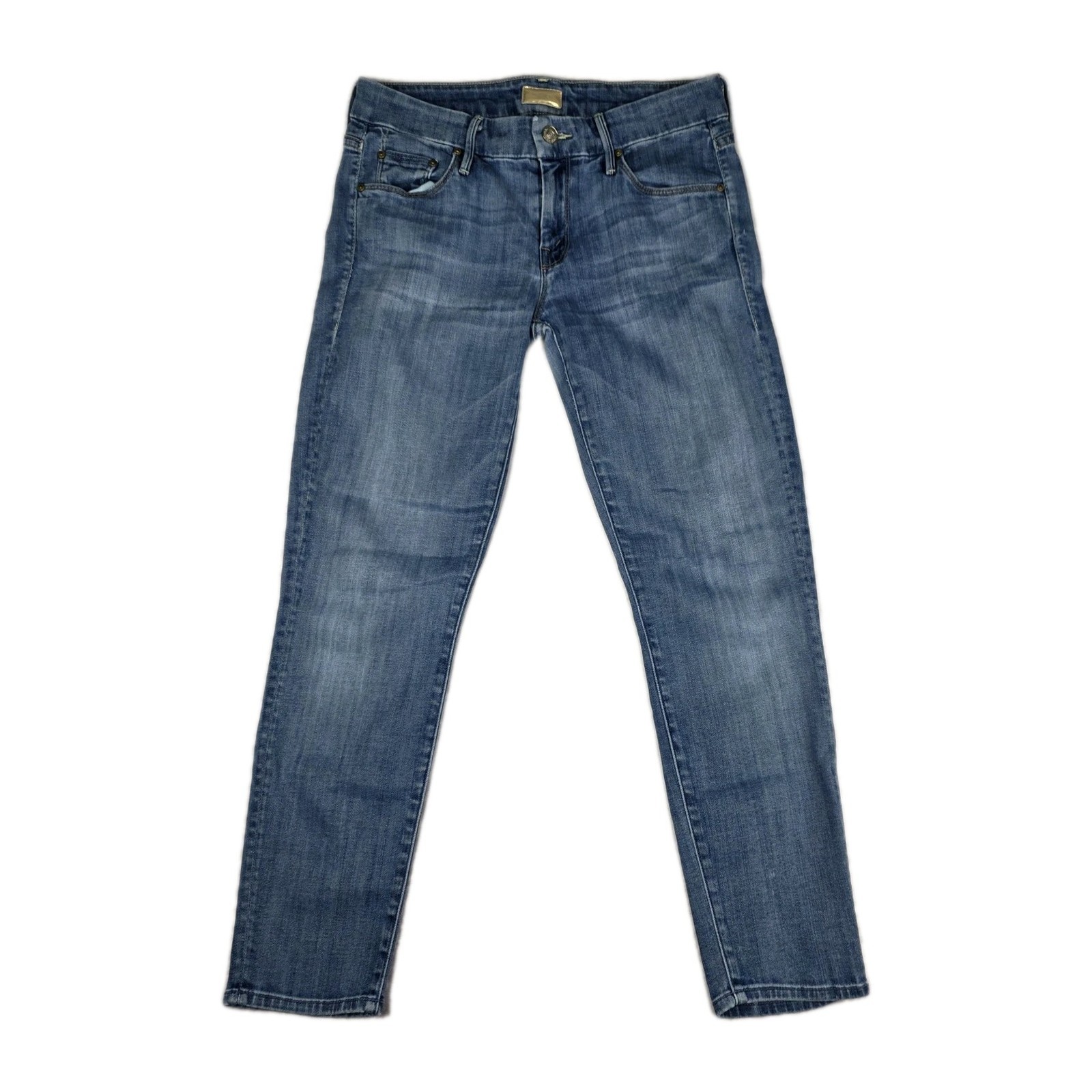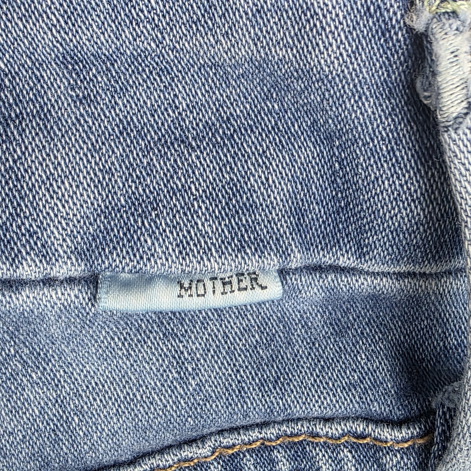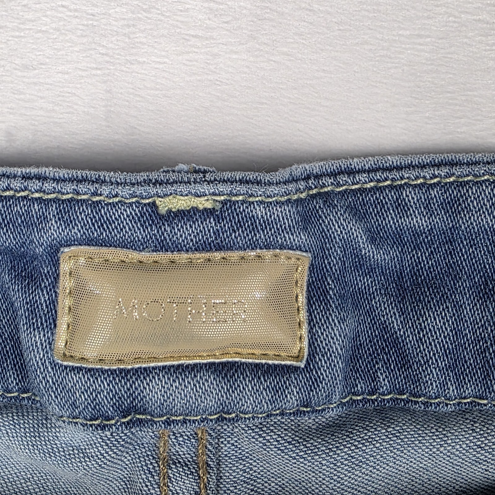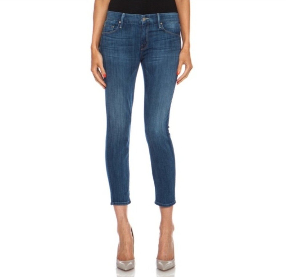 The Mother Jeans Women's Size 28 The Looker Crop in Leaving Paradise Blue Denim Pants are a stylish and versatile addition to any woman's wardrobe. Made from a blend of polyester, spandex, and cotton, these low-rise jeans feature a solid blue color with a medium wash. The cropped style and 25.5-inch inseam make them perfect for showcasing your favorite footwear while the regular fit ensures comfort and style. With a 5-pocket design, coin pocket, and logo accents, these jeans are both fashionable and functional, suitable for any season. Perfect for everyday wear or a night out in the city, these Mother Jeans are a must-have for any denim lover.