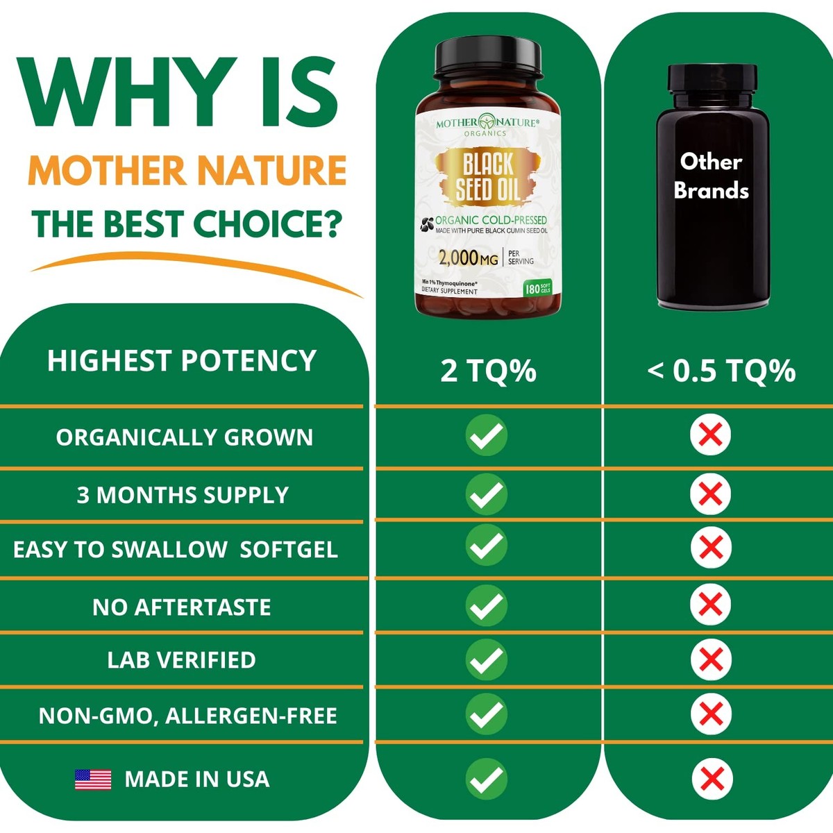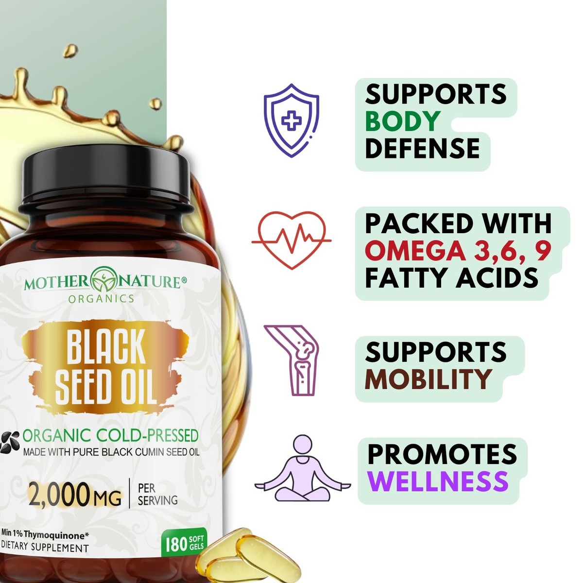 Mother Nature - Organic Black Seed Oil Capsules, 3 Month Supply, Cold Pressed, High TQ, 100% Turkish, Black Cumin Nigella Sativa Oil for Immune Support, Joint, Digestive Health,1000mg Capsule, 180ct