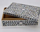 Add a touch of refined elegance to your vanity with this Mother of Pearl Inlay Jewelry Box in Grey. Handcrafted by skilled Indian artisans, this piece features intricate mother of pearl inlay work, creating a delicate and timeless floral pattern that glistens softly against a warm beige background.