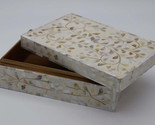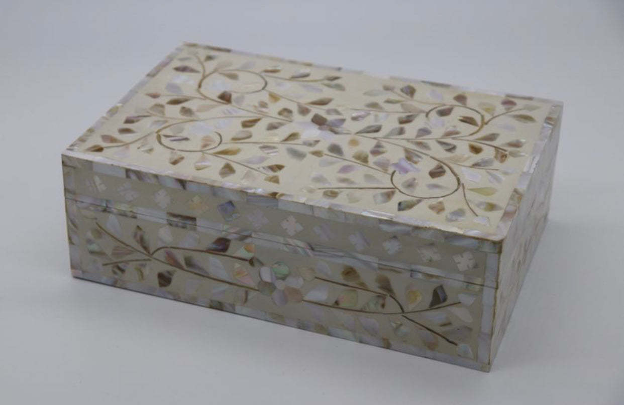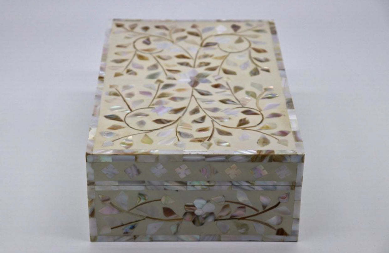Add a touch of refined elegance to your vanity with this Mother of Pearl Inlay Jewelry Box in Beige. Handcrafted by skilled Indian artisans, this piece features intricate mother of pearl inlay work, creating a delicate and timeless floral pattern that glistens softly against a warm beige background.