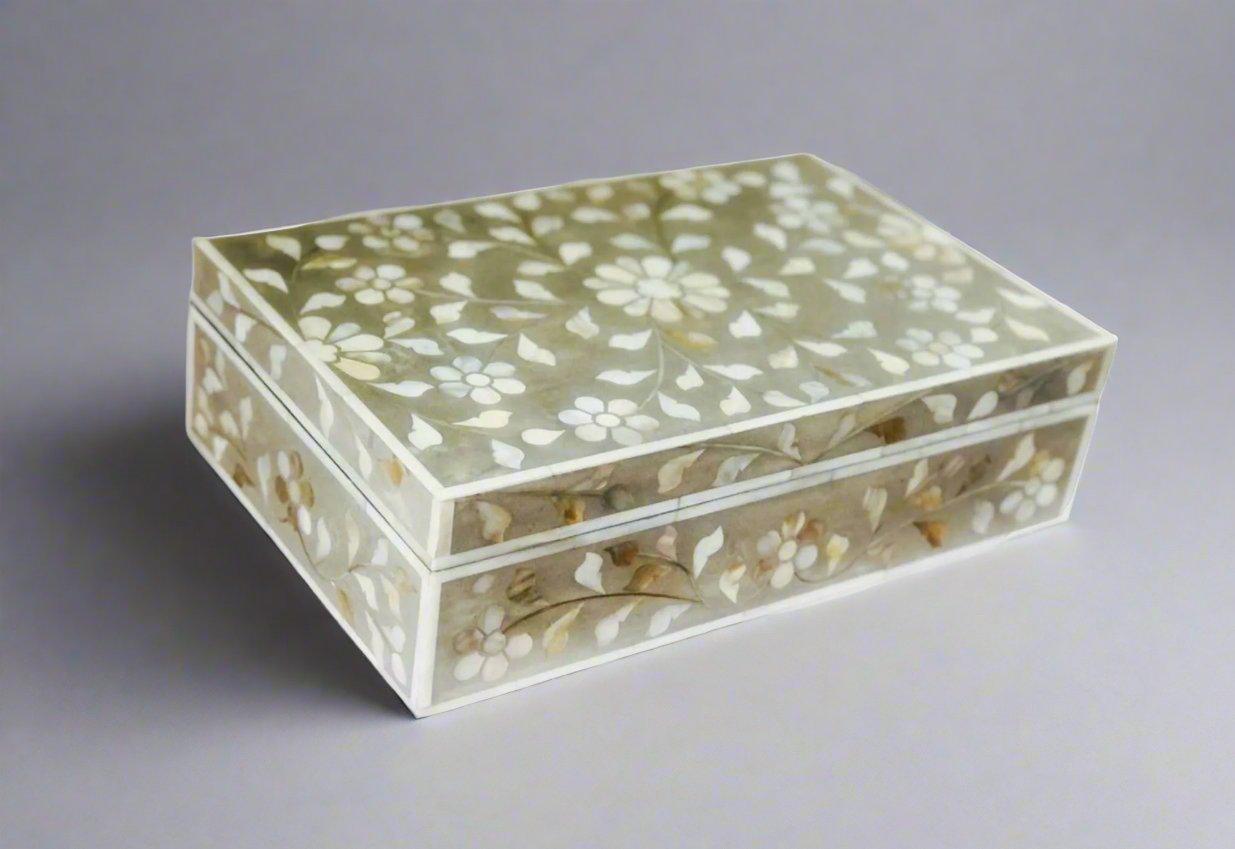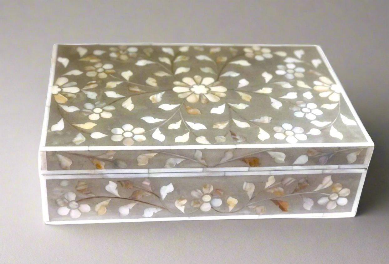 Mother of Pearl inlay wooden jewellery storage box for home in grey