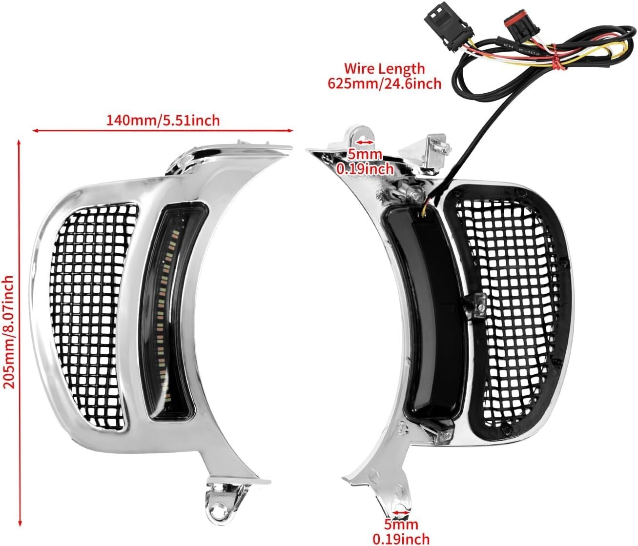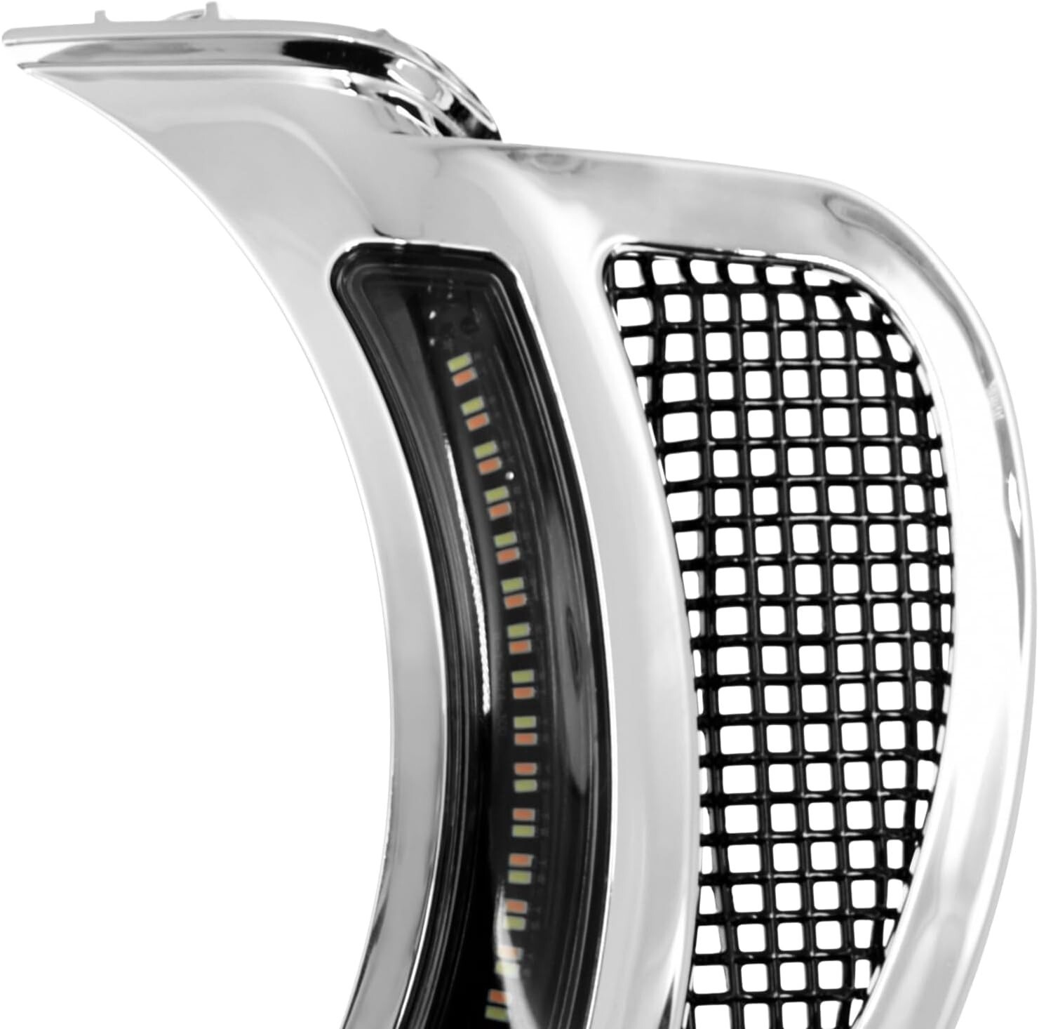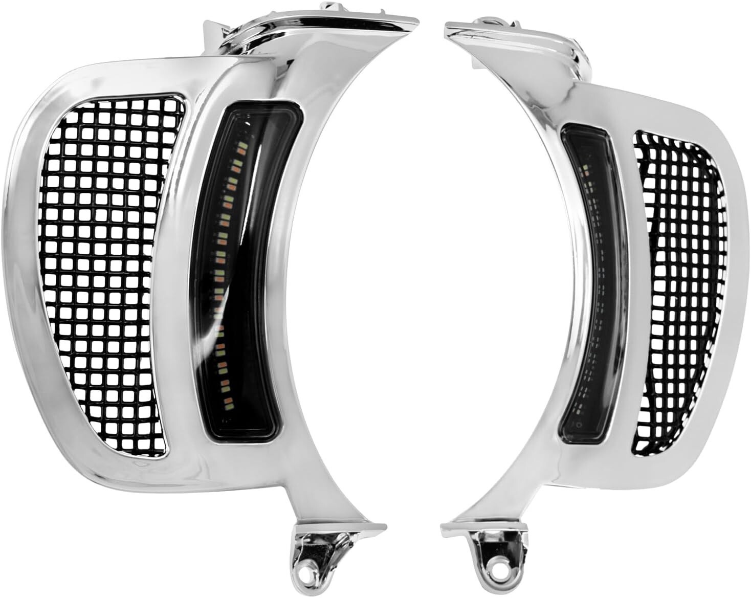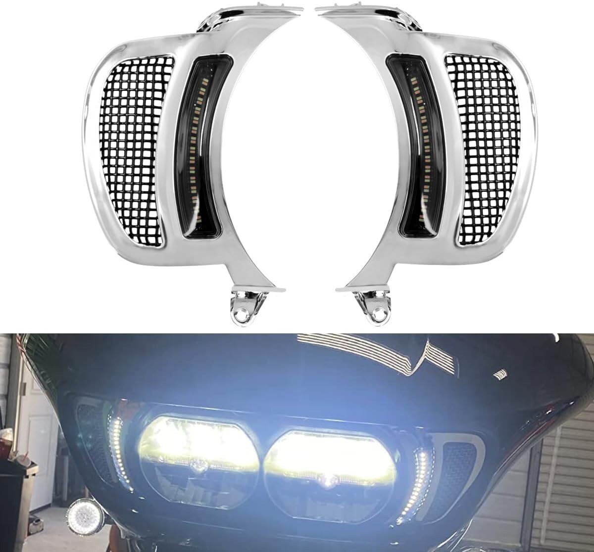 HDBUBALUS Motorcycle Headlight Vent Accent Turn Signal LED Indicator Side Lights For Harley Road Glide FLTRX 2015-2023 (Color: Chrome Housing Black Mesh) Fitment: Fit For Harley Road Glide 2015-2023 Made of High Quality ABS Plastic, full-time white Running Lights with Amber Turn Signal Functionality This Road Glide LED vent turn signal lamp has a stylish appearance, filling the gap between the headlight and the fairing. Easy to install, plug and play. Don't need make any modifications for the motorcycle. Package Included: 1 Set Headlight Vent Accents lights Buy with confidence. Check out our reviews. Also, happy to combine shipping to save you when you buy multiple items.