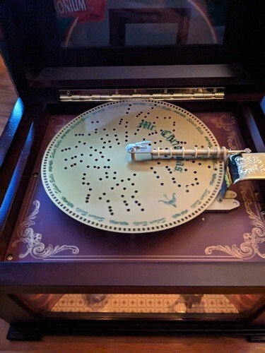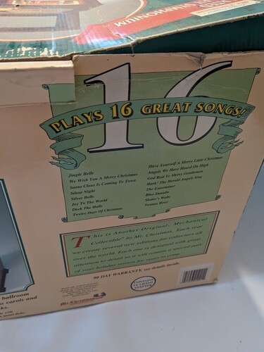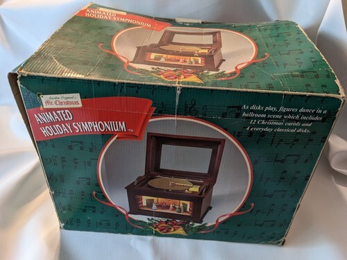 A vendre est une boîte de travail d'occasion Mr Christmas Animated Holiday Symphonium Turning Ballroom Music Box. Un seul disque est inclus.