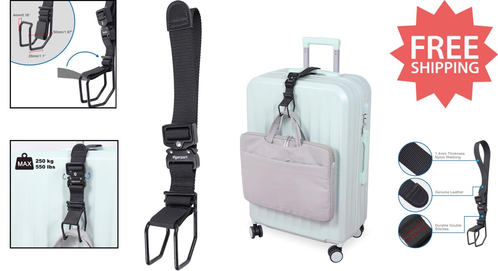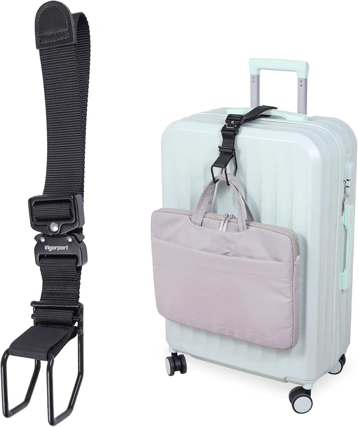 Upgrade your travel gear with the Vigorport Heavy Duty Luggage Hook Strap, crafted from high-quality, durable materials. The tough metal buckle, adjustable nylon strap, and sturdy J hook ensure reliable attachment to your luggage, keeping your belongings secure. Its unique design features a magic tape on the hook to prevent slipping, while the wide metal J hook (measuring approximately 4cm x 5cm) allows easy attachment of additional bags to your suitcase. Customize the length for a perfect fit, preventing your bags from dragging and ensuring effortless mobility. Versatile and practical, this travel accessory is ideal for handbags, computer bags, briefcases, and more, making your journey smoother and hands-free. Vigorport specializes in travel accessories, including luggage tags, straps, and hooks to enhance your travel experience.