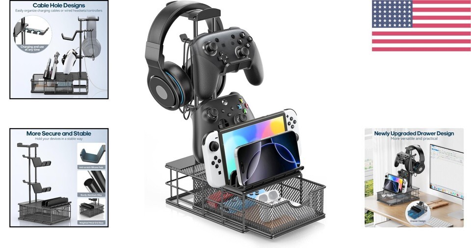- Multi-Device Headphone Stand with Drawer - Easy Assembly and Cable Management