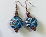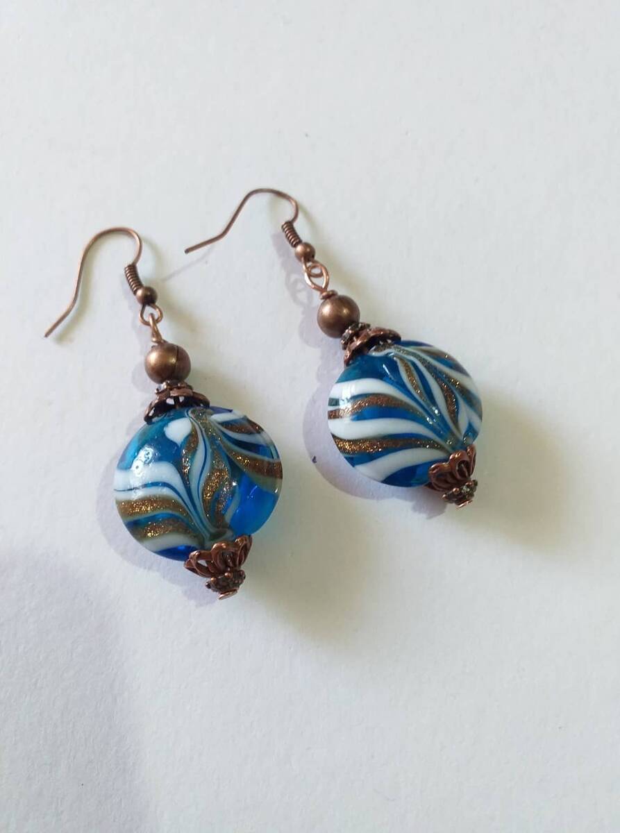 Bohemian copper Handmade Murano blue-white=bronze glass beads earrings . Bohemian copper jewelry.