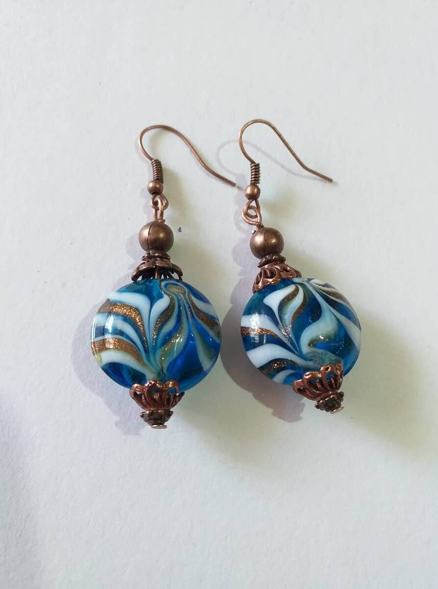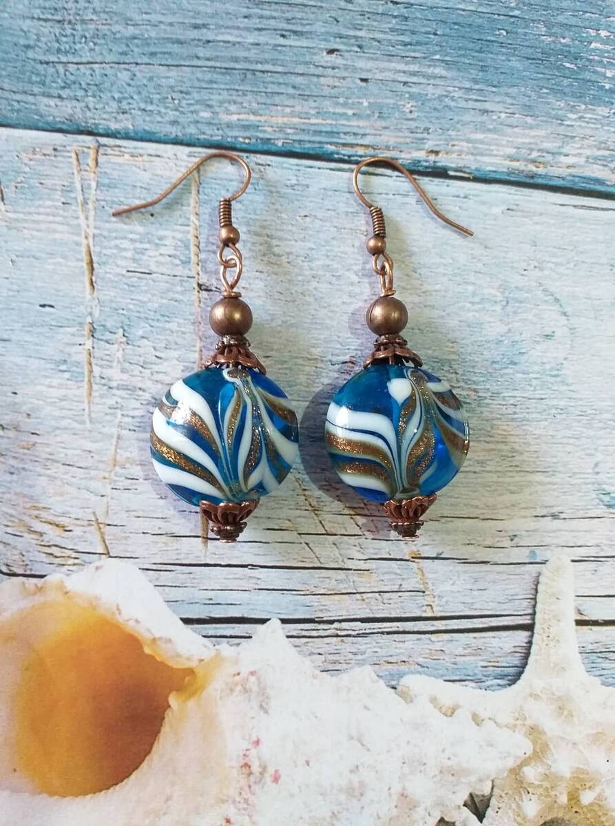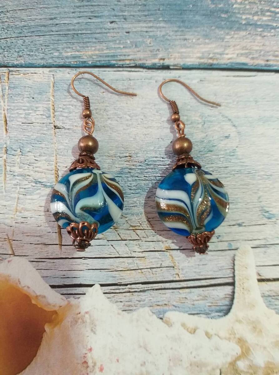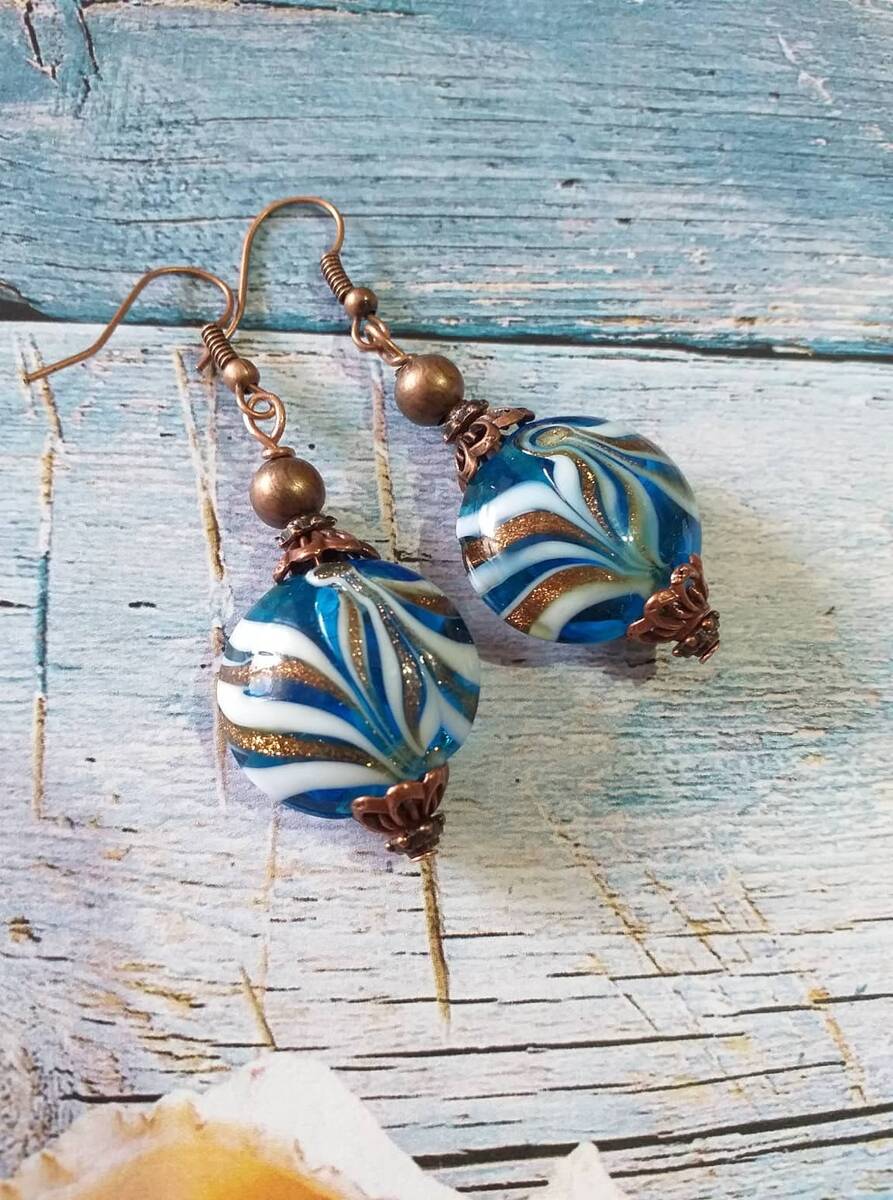 Murano copper blue earrings Copper earrings Boho Murano handmade glass jewelry earrings gypsy unique earrings blue white gold earrings gift
