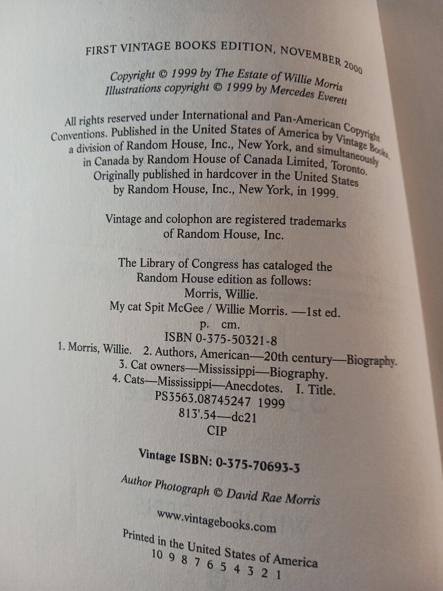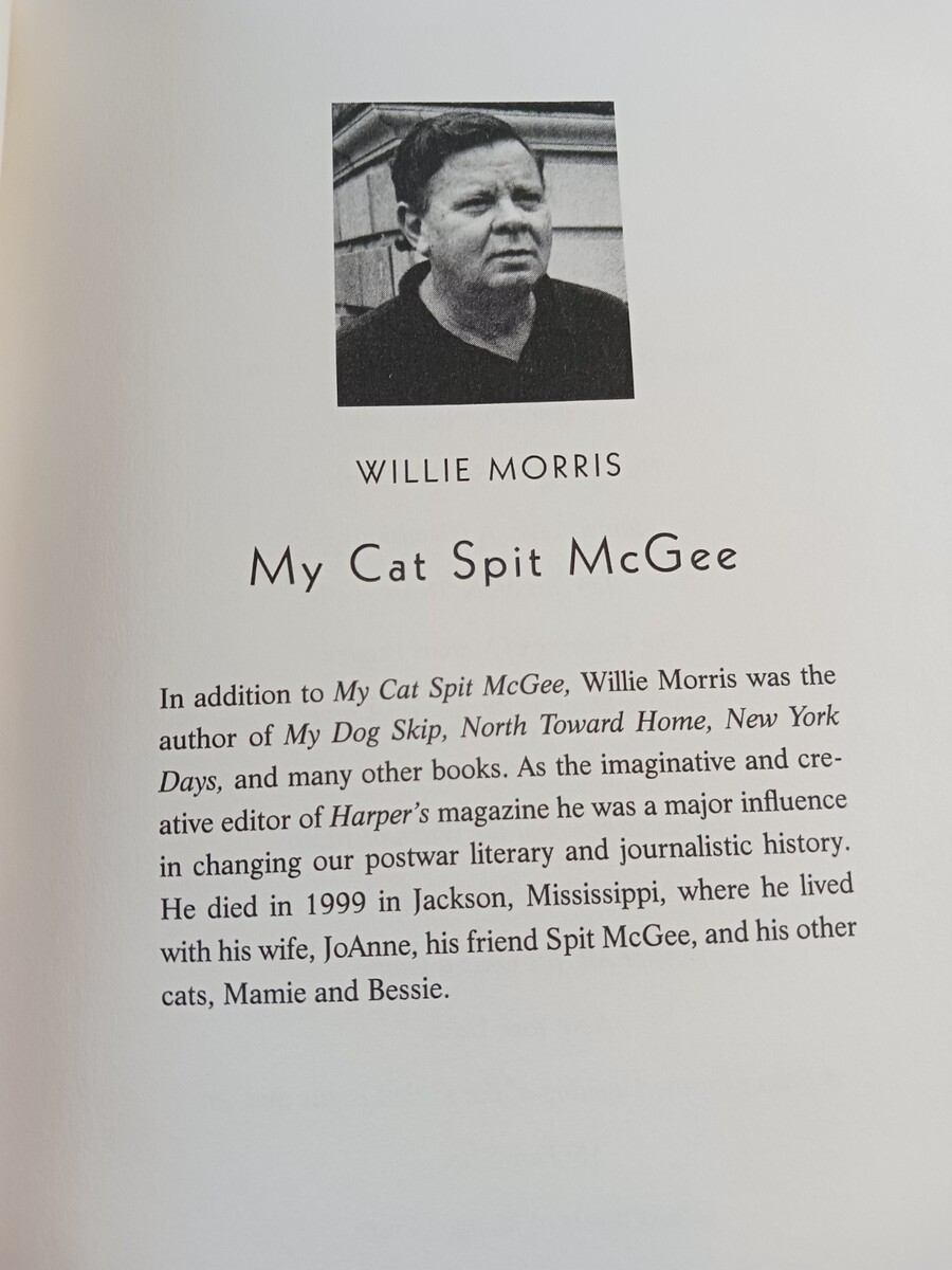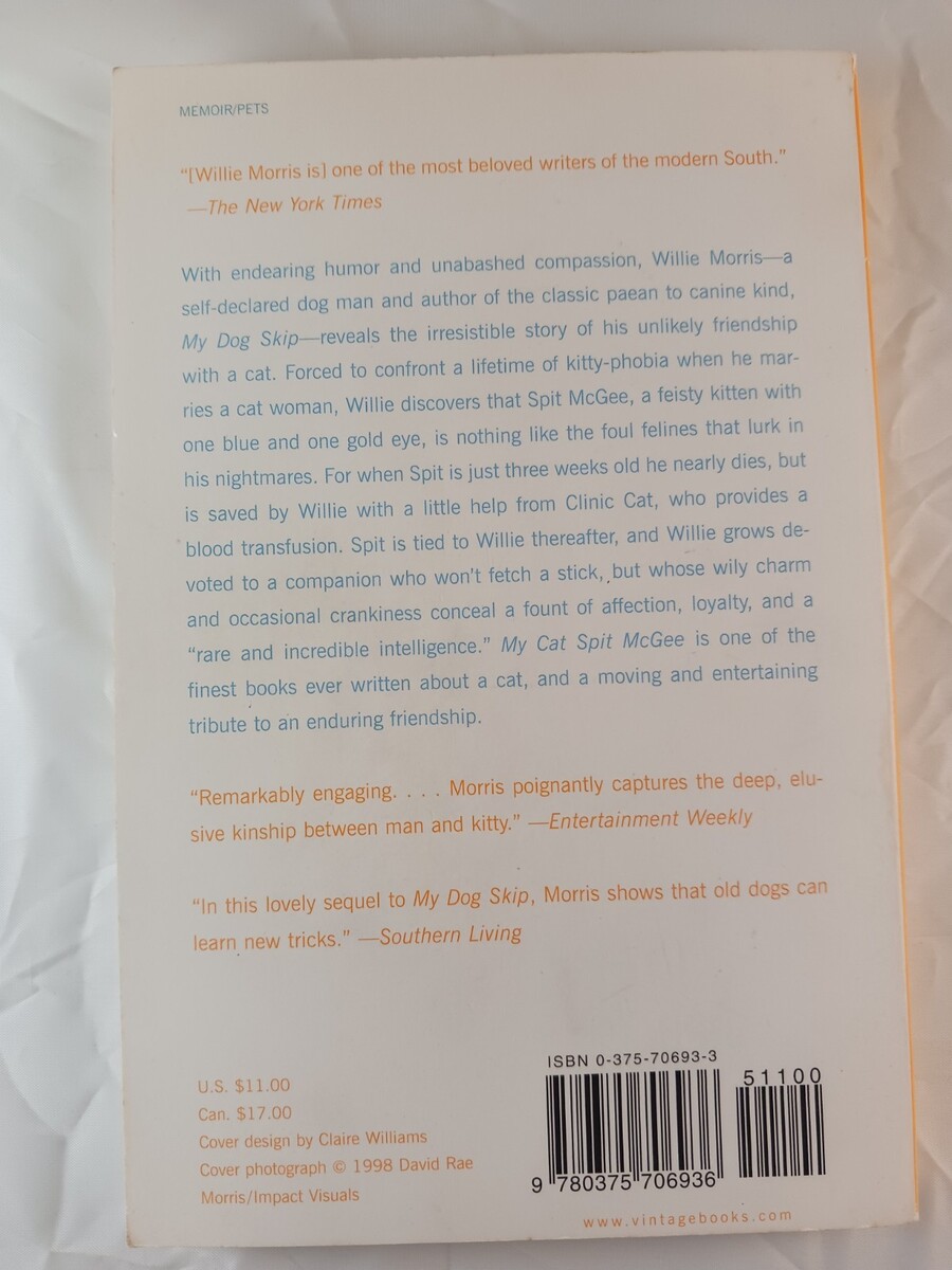 "My Cat Spit McGee" by Willie Morris is a trade paperback published in 1999 by Knopf Doubleday Publishing Group. This memoir explores the author's relationship with his cat, Spit McGee, and is infused with humor and personal reflections. The book, illustrated by the author himself, delves into the quirky world of cats and the unique bond between the author and his feline companion. With 160 pages, this light-hearted yet heartfelt memoir is a delightful read for anyone who loves cats and enjoys a good story. Willie Morris a Mississippi writer who also wrote My Dog Skip.