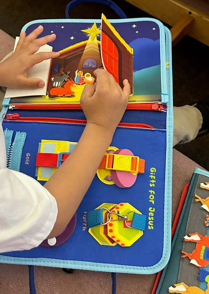 Gifts for Jesus Reflection: Open the three gift boxes from the wisemen. This engaging page includes fine motor skills practice with zippers, latches, and buckles, along with three removable felt pieces representing frankincense, myrrh, and gold. The last gift encourages the child to think of the self gift s/he can be to Jesus and others.
