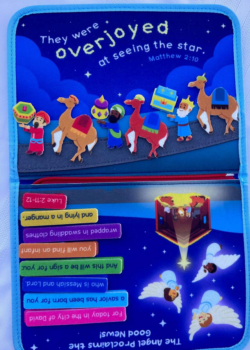 Wisemen Journey: Inspired by Matthew 2:10, this page depicts the joy of the wisemen as they travel with gifts and camels, following the Christmas star. Kids can unzip the page and position the wisemen next to the manger scene for an interactive storytelling experience.