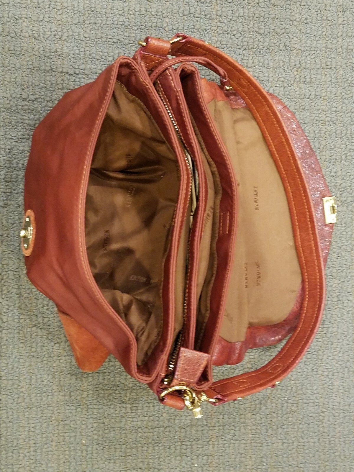 Up for sale is a Mz Wallace handbag in gently used very good condition. The bag has three compartments, zipper closure on one and magnetic closures on the others. Interior has one zipper compartment and two open pockets with an attached to key chain.