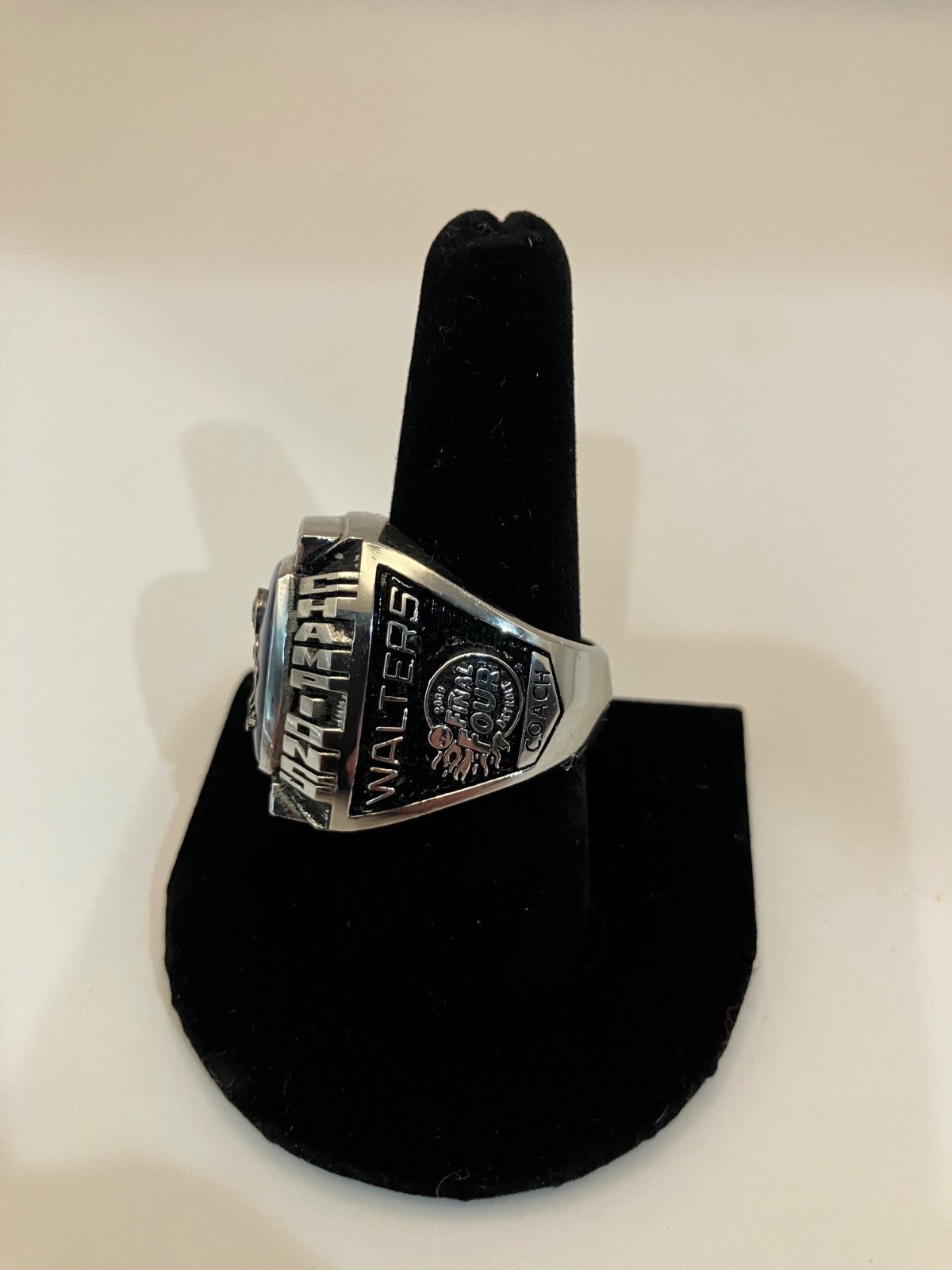 This ring is a size 10 salesman sample. It is marked WALTERS where the players name usually goes and the word COACH below that. Made by Herff Jones with ULT alloy and fake stones. Really good display item or conversation piece.