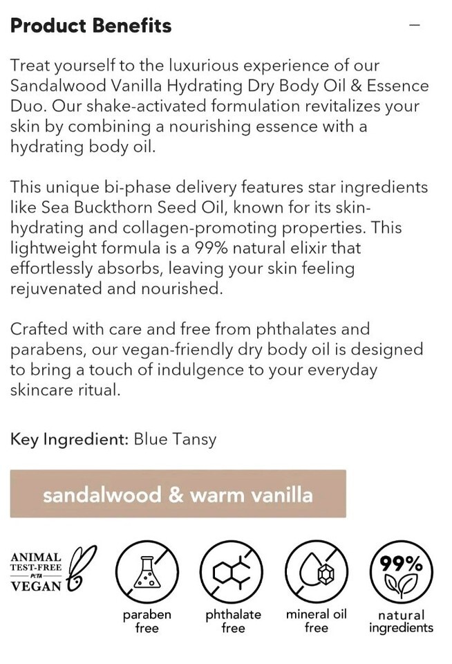 Treat yourself to the luxurious experience of our Sandalwood Vanilla Hydrating Dry Body Oil Essence Duo. Our shake-activated formulation revitalizes your skin by combining a nourishing essence with a hydrating body oil.