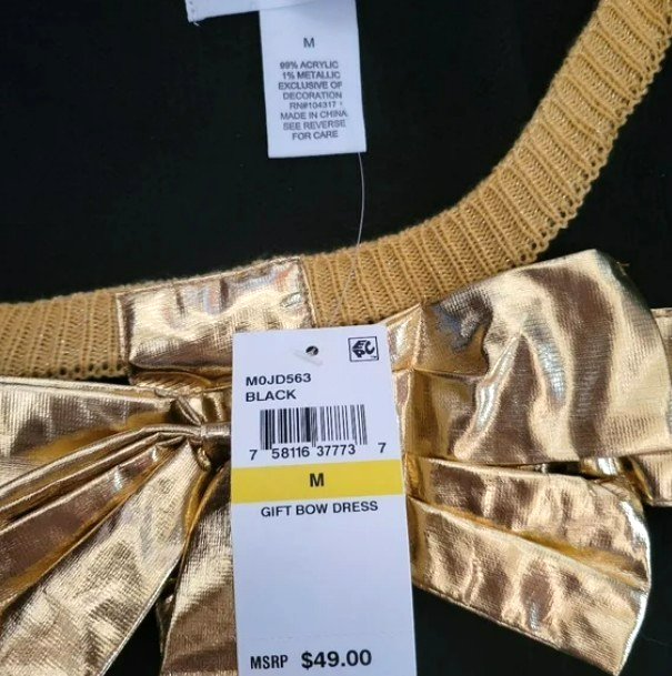 Wrapped up in a bow, this Christmas present gift dress is fun and festive for the holidays. Dress features a playful design decorated with colorful gift bows in the front. Material has stretch. Retails price $49