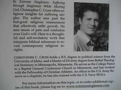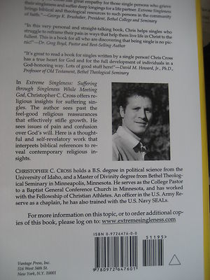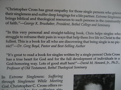 This book is written is a totally different fashion from most Christian Singles books. Perspective is that Singleness can be a tough, challenging time, for many Christians. Instead of calling singleness something it is not ("A time to be celebrated and cherished, before the rigors of marriage"), call it what it is for many - A Struggle!! But use that "struggle" for the glory of God. This book walks one through that process in a biblically-grounded and entertaining method. The author is associated with the National Association of Evangelicals, and the Southern Baptist Convention. Best selling author Greg Boyd has endorsed this book. So too, has the long-time President of Bethel University, as well as Old Testament Theologian Dr. David Howard. If you are a Christian Single, or if you kn