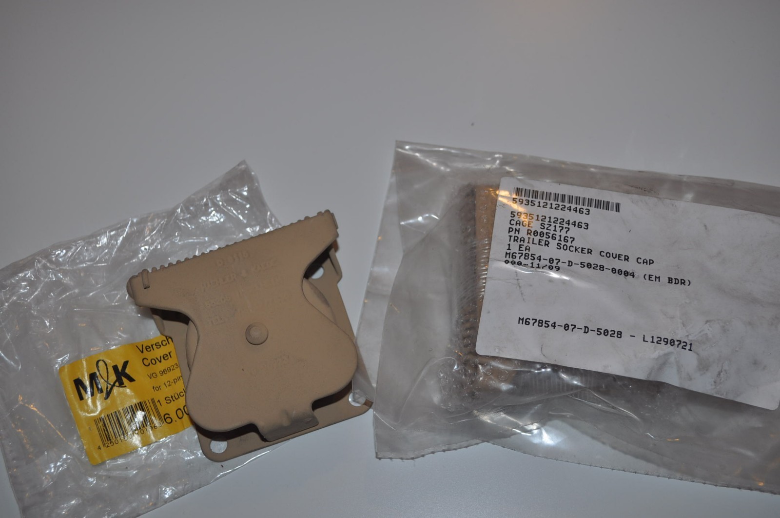 Military Spec and Mil Surplus - RV Truck Trailer Cap Cover LOT of 2 This is a great item for your RV truck/ trailer hook up. This will also work for your big truck receptacles that need covering. Looks like there were a few manufactures - one German one Maehler and Kaeol and another is BAE. Spring is tight. and this is heavy! Dimensions - 3 " by 3" - sticks out about an inch. you will love this. Will ship international.