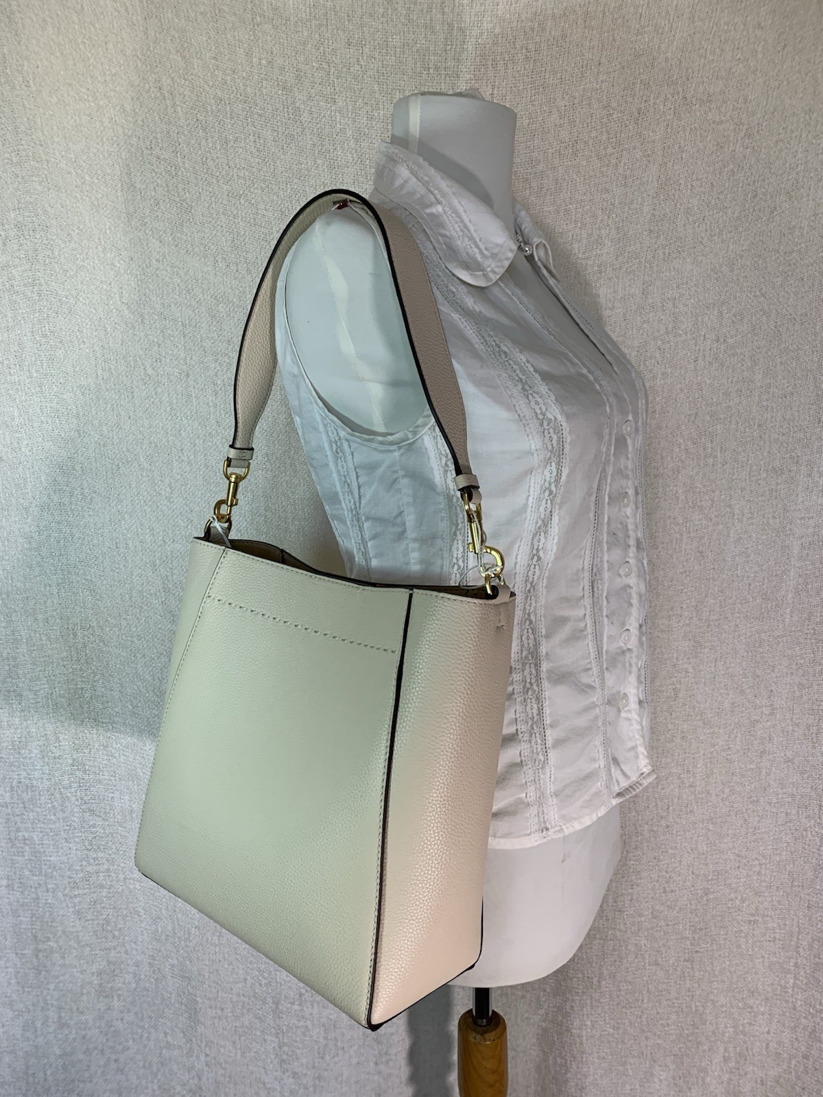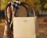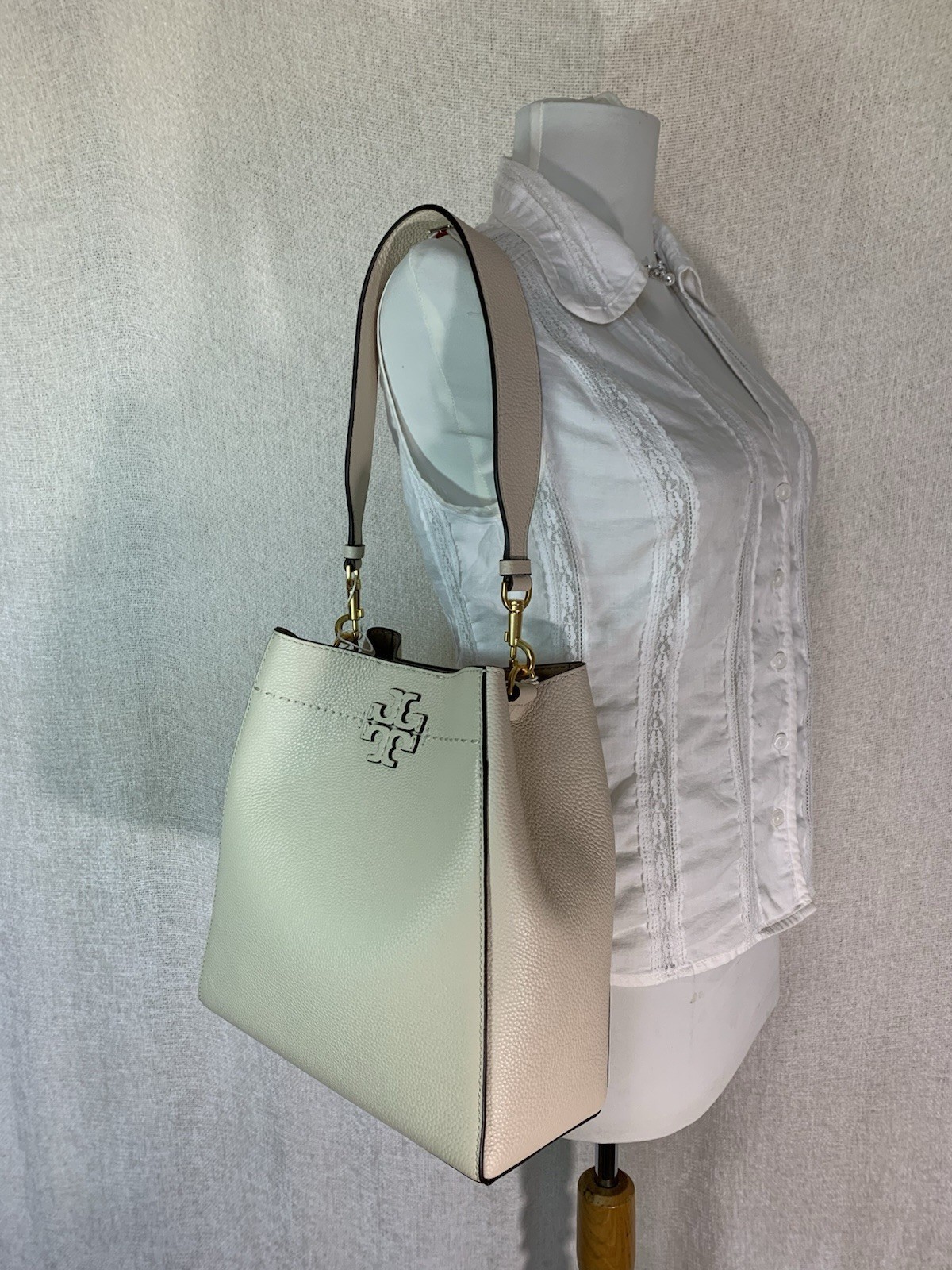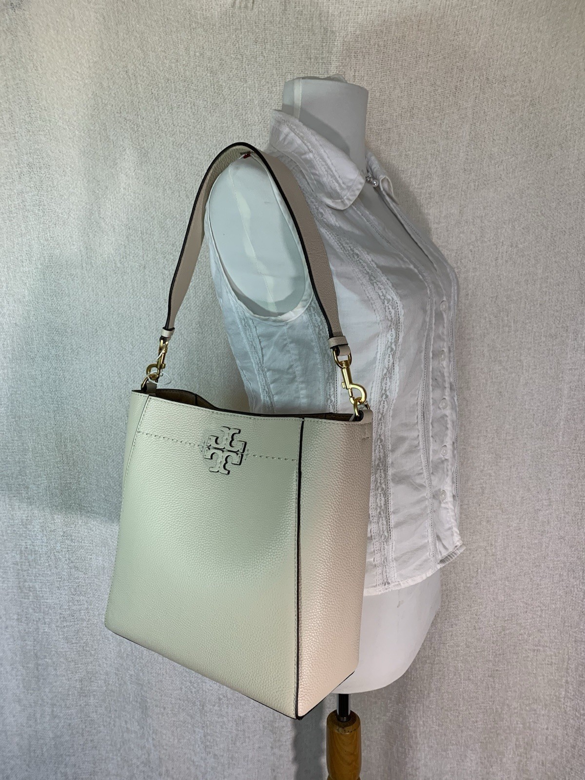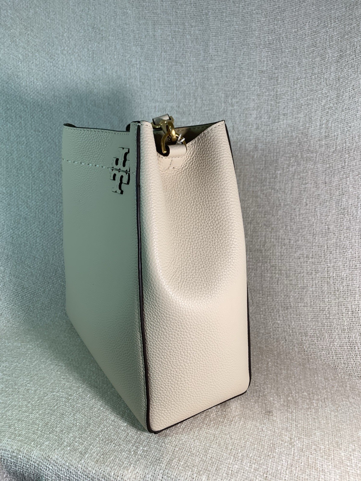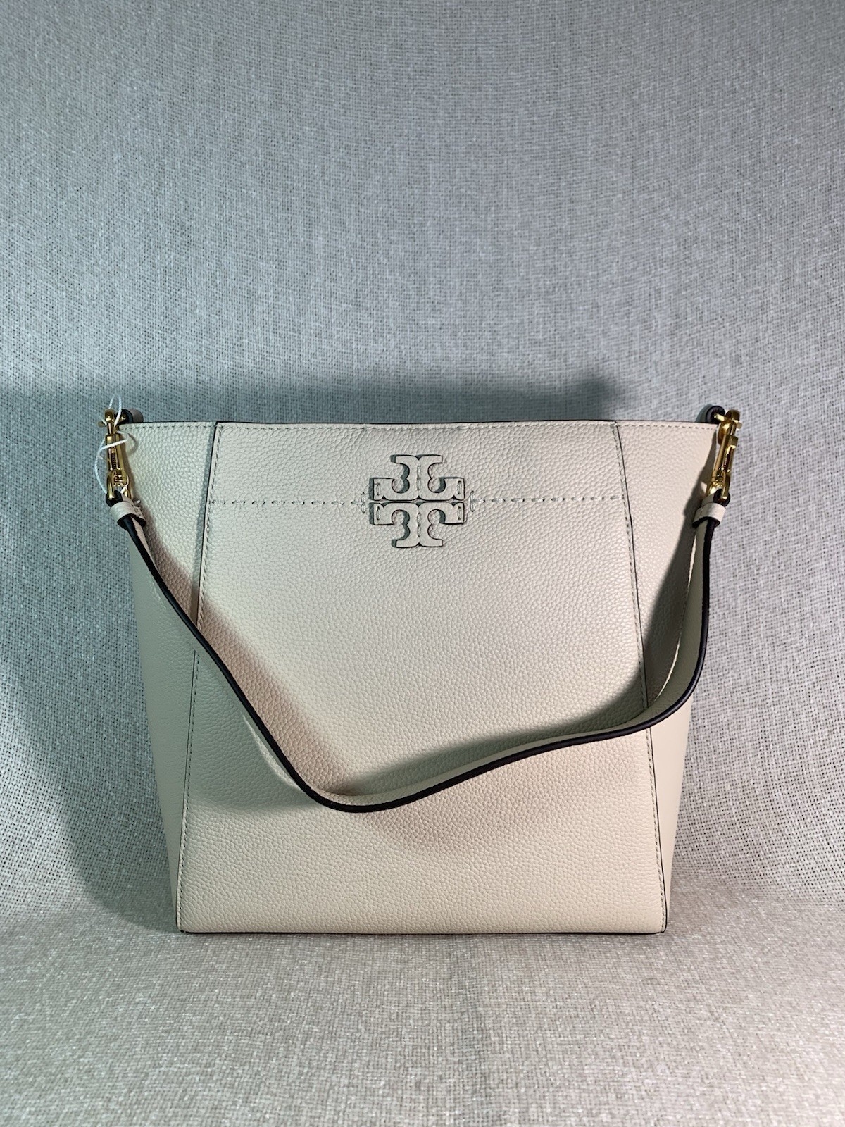 - NEW Tory Burch McGraw Brie Cream Pebbled Leather Bucket Shoulder Tote Bag