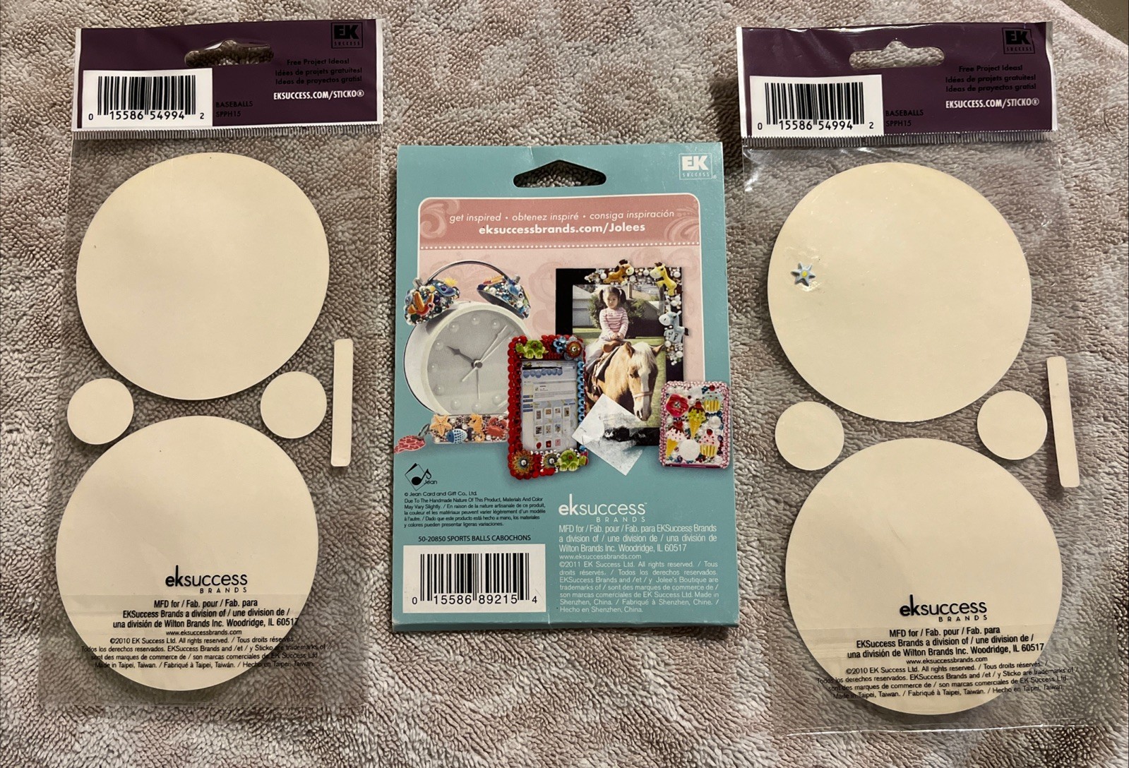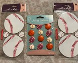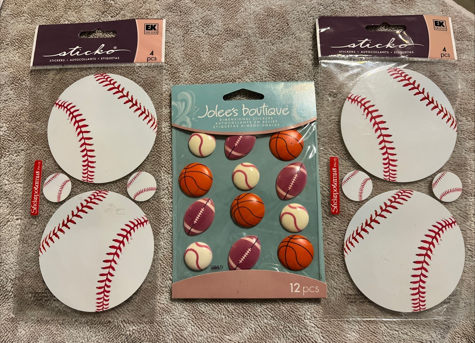 The product is a set of three packs of sports-themed stickers by EK Success Stickopotamus and Jolee?s Boutique. 12 Dimensional Spirts Balls Cabochons + 8 flat stickers for your enjoyment. The stickers feature a variety of baseball, basketball, and football designs in multiple colors, suitable for scrapbooking projects. These embellishments are perfect for crafting and adding a sporty touch to your scrapbook pages. Made in China, these stickers are a great addition to any sports enthusiast's crafting supplies. See photos: both sides of unopened packages (smoke-free home)